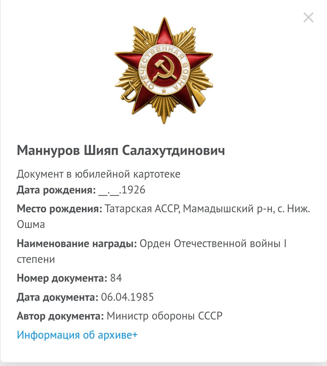 МАННУРОВ ШИЯП САЛАХУТДИНОВИЧ Прикреплённые изображения: ФронтовикиУчастники войны Опубликовано 6 мая, 2022 - 01:02 пользователем Гульназ Фарзиева