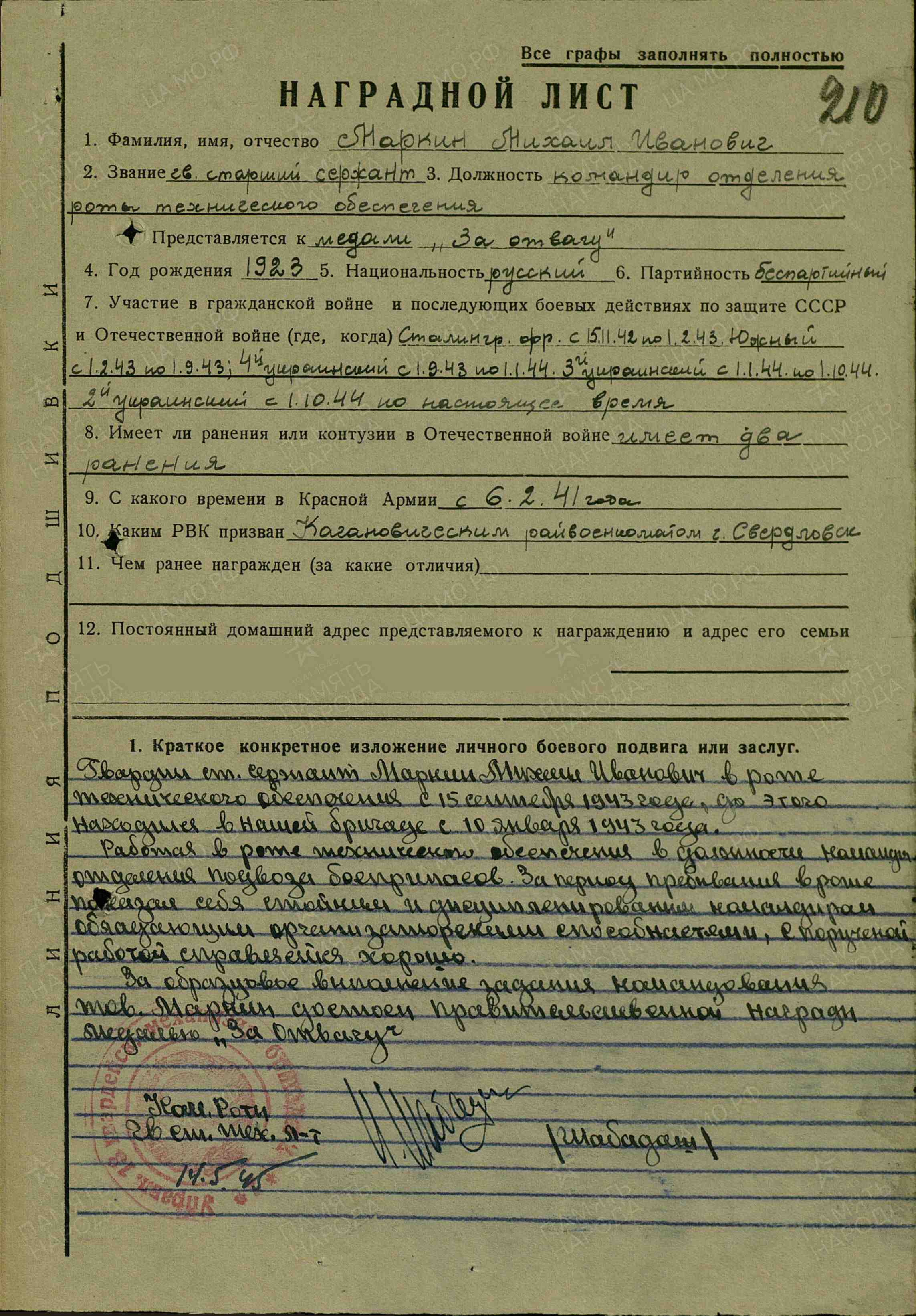 МАРКИН Михаил Иванович, 1923, с. Билярск. Мобилизован Кагановичским РВК г. Свердловск 7 марта 1942. Воевал на Сталинградском, Южном, 4, 3 и 2 Украинском фронте. Перенёс два ранения. Сержант/ гв. ст. сержант, ком. отделения роты технического обслуживания (РТО) 71 МехБр/ 13 гв. МехБр 13 ТК/ 4 гв. ТК в составе 57 А/ 51 А/ 2 гв. А/ 3 гв. А/ 6 гв. ТА. Награждён медалями «За оборону Сталинграда», «За отвагу», орденом Отечественной войны 1 ст. (1985).