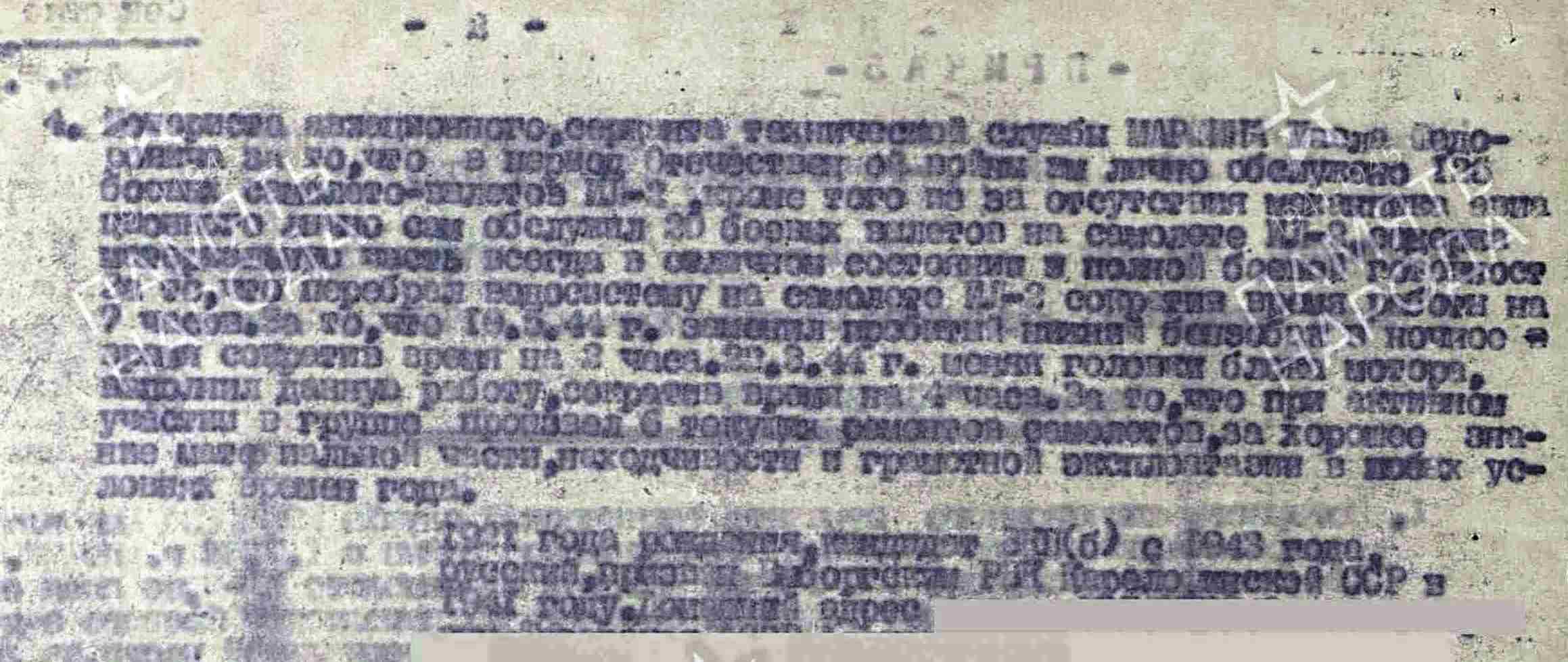 МАРКИН Павел Фёдорович, 1921, с. Лебяжье. Призван в апр. 1941 Выборгским РВК Карело-Финской ССР. С янв. 1944 воевал на Волховском, Ленинградском, 3 и 2 Прибалтийском фронте в составе 13 ВА/ 14 ВА. Канд. ВКП(б). Сержант, моторист авиационный 606 ШАП 280 САД/ ШАД. Обслужил 146 боевых вылетов самолётов ИЛ-2 и других типов. Награждён медалью «За боевые заслуги».