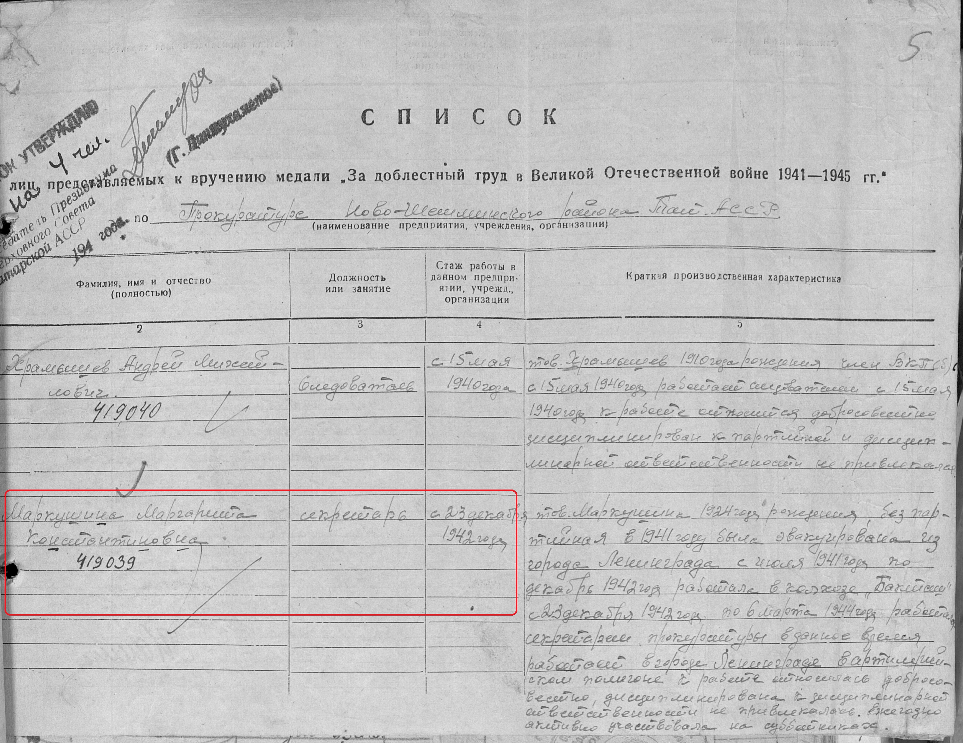 Маркушина Маргарита Константиновна родилась в 1924 году в г.Ленинград. Место жительства: с.Ново-Шешминск Ново-Шешминский район ТАССР В годы Великой Отечественной войны в Прокуратуре Ново-Шешминского района ТАССР секретаршей. Награждена медалью "За доблестный труд в Великой Отечественной войне 1941–1945 гг." (Акт от 28 апреля 1947 г, фонд 3610, опись 2, дело № 325, лист 3). Выбыла.