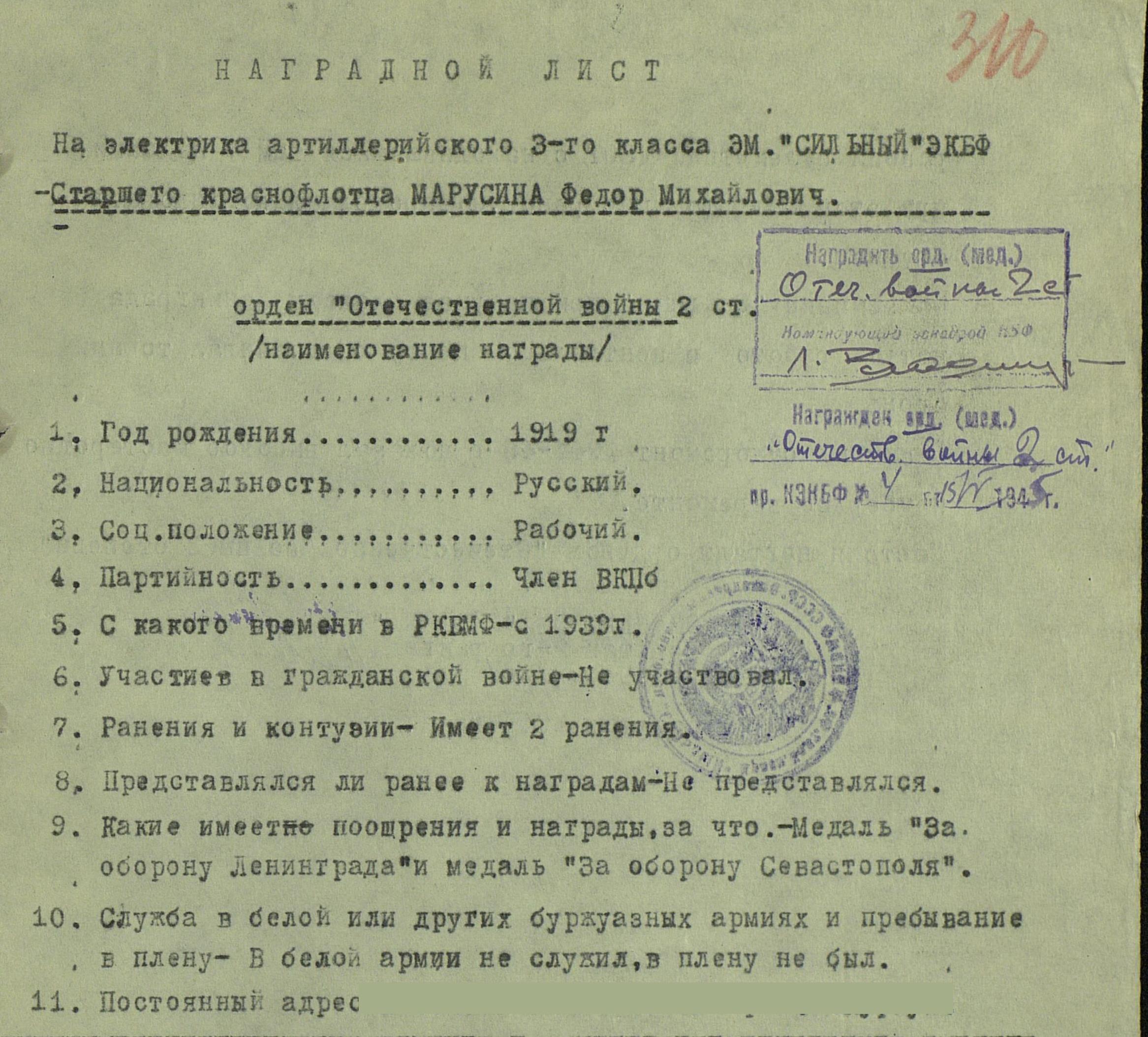 МАРУСИН Фёдор Михайлович, 1919, с. Куркуль. Мобилизован на службу Зеленодольским РВК. На флоте с 1939 г. Старший краснофлотец. Проходил службу на крейсере «Молотов» Черноморского флота в должности артиллерийского электрика. Был тяжело ранен во время авианалёта на корабль, проявил мужество при тушении горевших боеприпасов. Награждён медалью «За оборону Севастополя». С сентября 1942 г. – на сухопутном фронте под Новороссийском в качестве командира развед. отделения, командира противотанкового орудия. Захватил 3 «языка», в т.ч. офицера с важными документами. Прямой наводкой подбил 2 танка и ДЗОТ. При этом был вторично ранен. При прорыве блокады Ленинграда служил на эскадренном миноносце «Сильный» на центральном посту и обеспечивал точный огонь орудий. В 1944-1945 гг. показал высокое мастерство и усердие в ремонте эсминца. Награждён медалью «За оборону Ленинграда», орденом «Отечественной войны 2 ст.» (1945г), орденом Отечественной ыойны 1-степени (1985г.) и другими медалями. Проживал в п.г.т. Алексеевское. Скончался в 2016 г.
