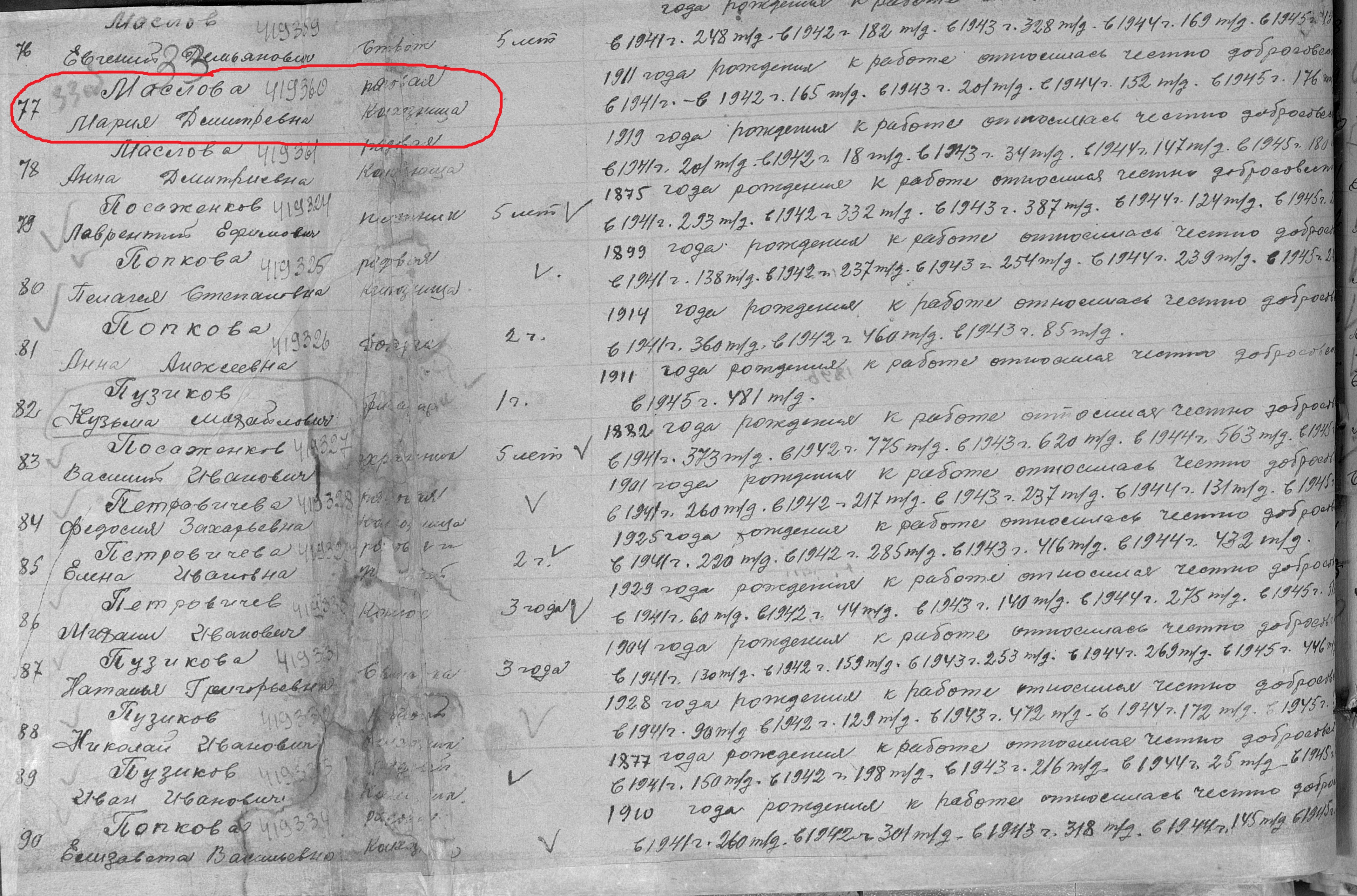 Маслова Мария Дмитриевна родилась в 1911 году. Место жительства: с.Ново-Шешминск Ново-Шешминский район ТАССР. В годы Великой Отечественной войны работала в колхозе «Красный Октябрь» рядовой колхозницей. Награждена медалью "За доблестный труд в Великой Отечественной войне 1941–1945 гг." (Акт от 28 апреля 1947 г, фонд 3610, опись 2, дело № 325, лист 33, № 419360).