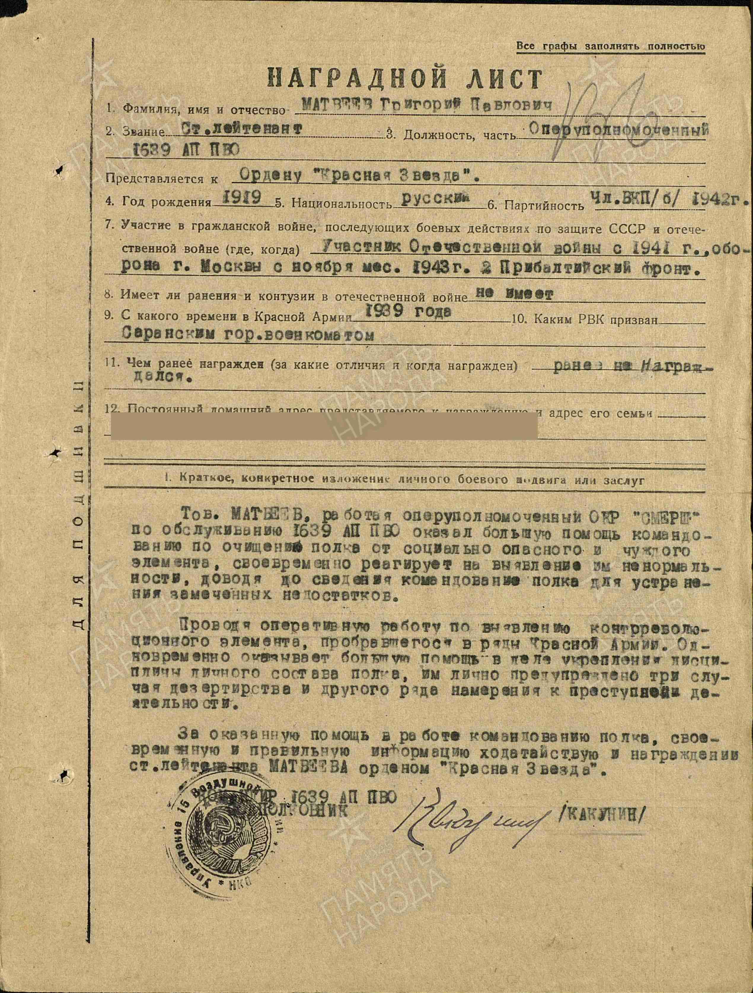 МАТВЕЕВ Григорий Павлович, 1919, д. Ст. Муллино. Мобилизован Сталинским РВК г. Саранск МордАССР 15 сент. 1939. Ст. лейтенант/ капитан, оперуполномоченный отдела контрразведки «СМЕРШ» при 1639 зенитно-артиллерийском аэродромном полку ПВО 15 Воздушной Армии Московской зоны обороны, ЦентрФ, 2 ПрибФ. Награждён медалью «За оборону Москвы», орденами Красной Звезды (1944), Отечественной войны 2 ст. (1945). Скончался в 1977.