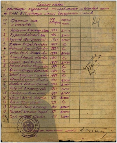 19.05.45 г. из в/ч 68496 был направлен в Кузнецкую школу воздушных стрелков (Пензенская область, 67-ой ВАШВС), где получил специальность радист и воинское звание младший сержант. Учёбу закончил в конце 1945 года.