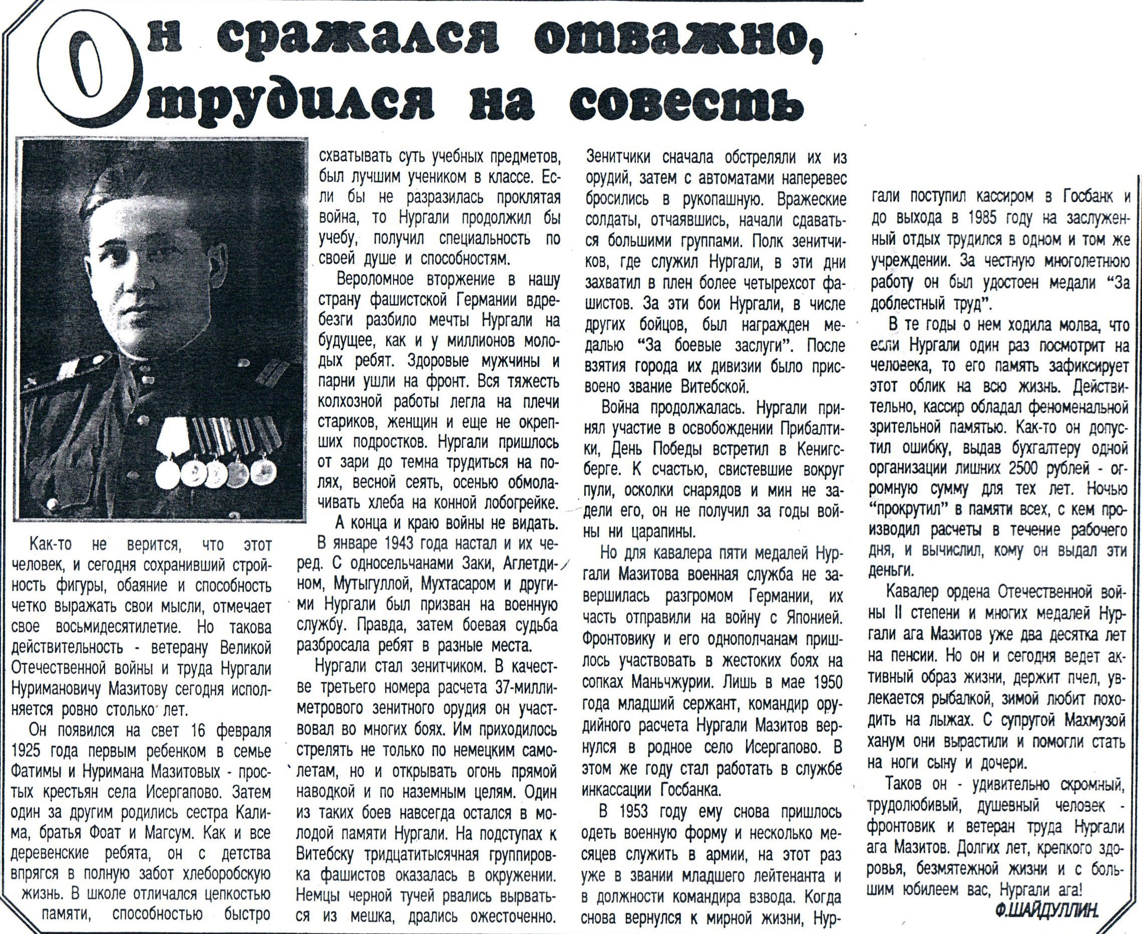 Командир оружейного расчёта младший сержант Нургали Мазитов в родное село Исергапово возвращается только в 1950 году.