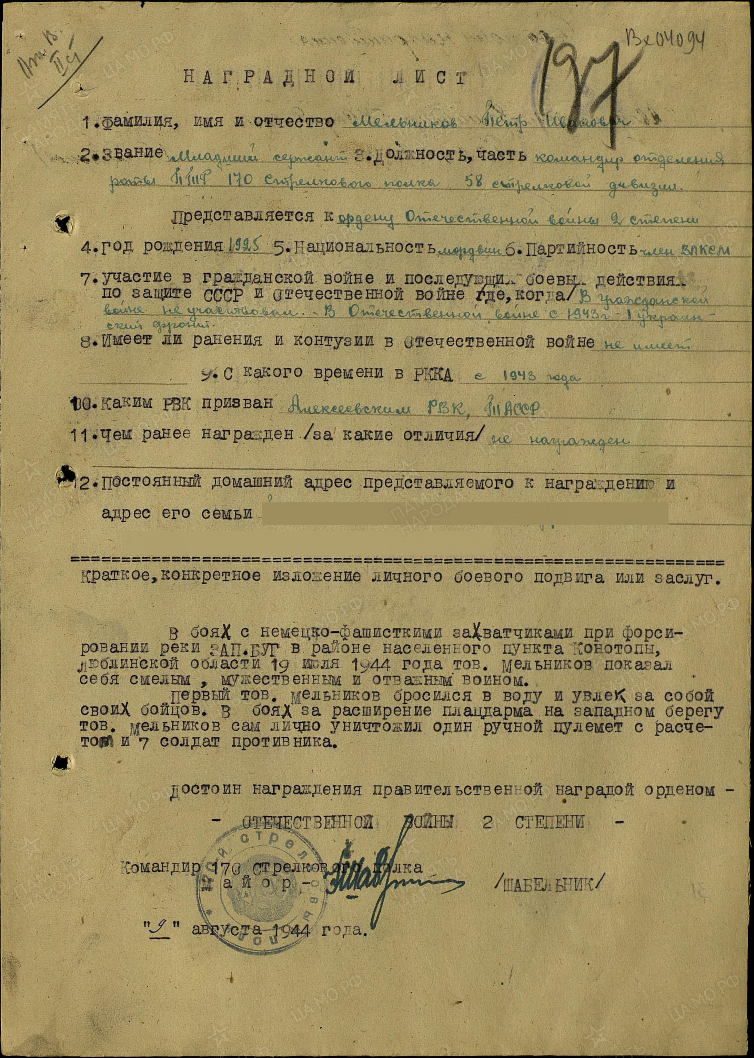 МЕЛЬНИКОВ Пётр Иванович, 1925, д. Войкино. До призыва в армию работал в к-зе "Красный борец". Мобилизован Алексеевским РВК в янв. 1943г. Воевал в составе 1 Украинского фронта. Мл. сержант, ком. отделения роты ПТР 170 СП 58 СД 22 СК. Отличился в боях при форсировании р. Западный Буг и удержании плацдарма в июле 1944. Награждён орденом Отечественной войны 2 ст.