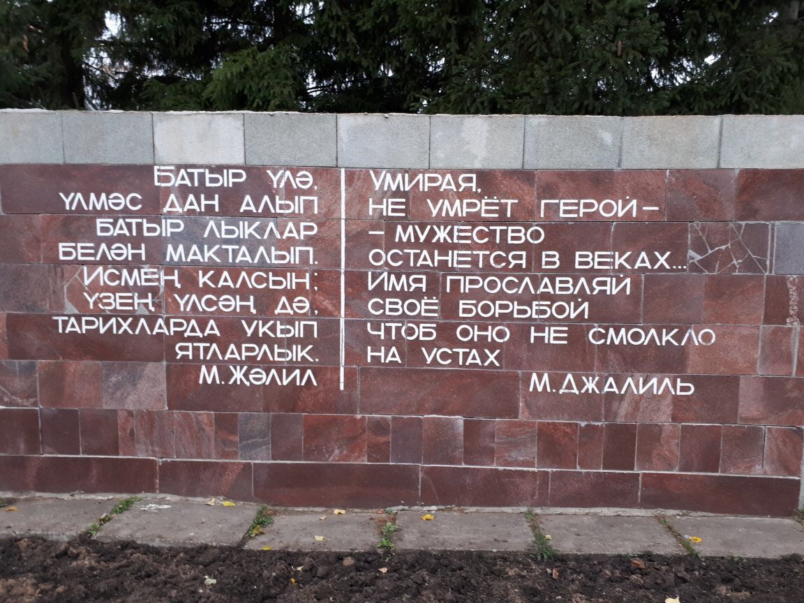 - В правой части на гранитном постаменте (2,5 x 6) выбит отрывок из стихотворения "О героизме" М. Джалиля на татарском и русском языках: «Умирая, не умрет герой – мужество останется в веках. Имя прославляй своё борьбой, чтоб оно не смолкло на устах. М.Джалиль».