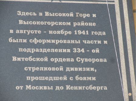 МЕМОРИАЛЬНАЯ ДОСКА С НАДПИСЬЮ О ФОРМИРОВАНИИ ВОИНСКИХ ЧАСТЕЙ НА ТЕРРИТОРИИ С.ВЫСОКАЯ ГОРА И Ж/Д СТ. ВЫСОКАЯ ГОРА. НА ЗДАНИИ ВСШ № 1В П. Ж/Д СТАНЦИЯ ВЫСОКАЯ ГОРА