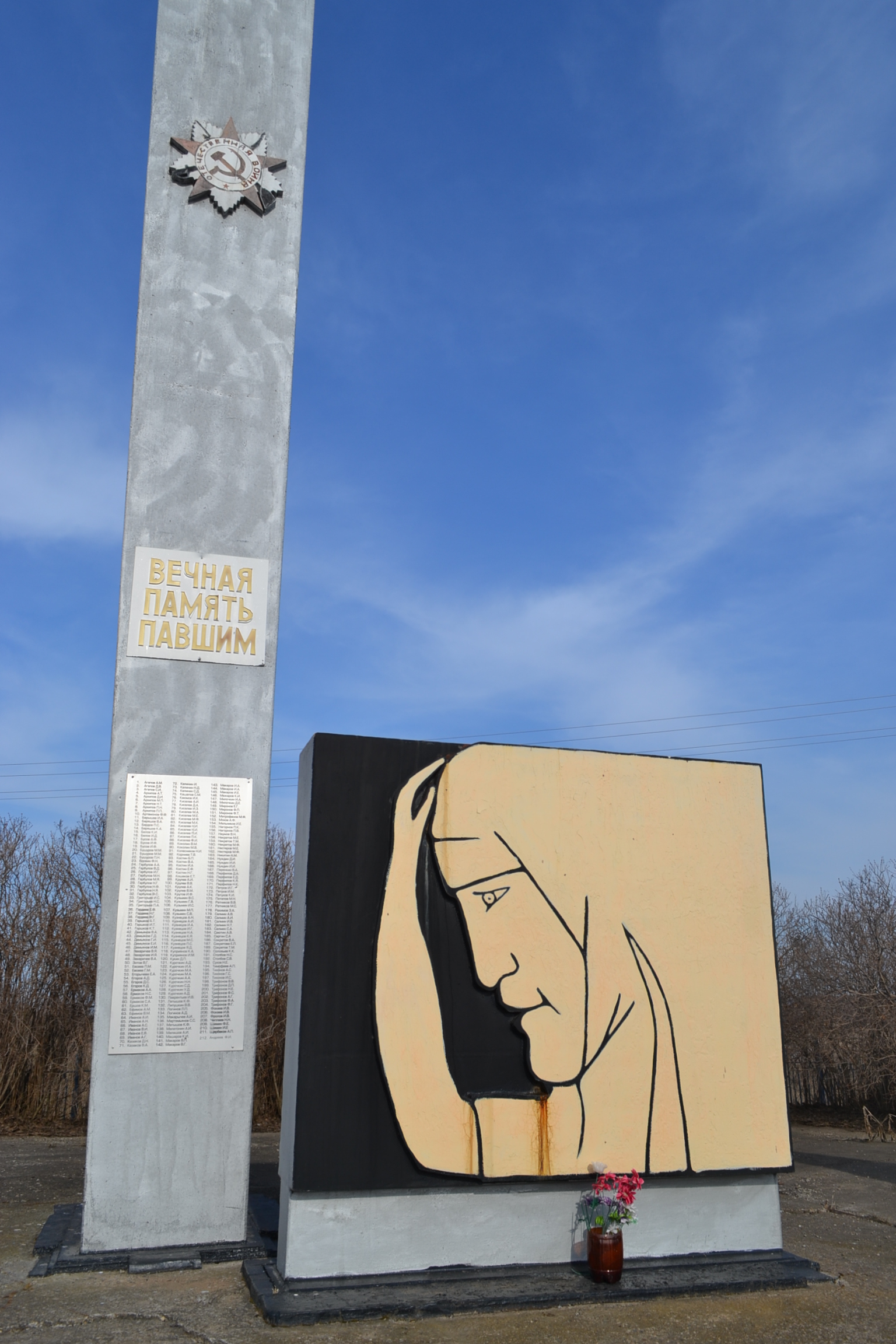 Мемориальный комплекс "Скорбящей матери" состоит из памятника Воинам ВОВ, стелы "Вечная память павшим" с табличкой ФИО погибших воинов в ВОВ. изготовлена из стали Стела с барельефом Герою Советского союза Майкову Николаю Ивановичу. Комплекс расположен в центре села напротив школы. Имеются ограждение и зеленые насаждения. Матриал железобетон. Датировка объекта 1975 года. Стела имеет размер 1м х5., высота 10 м., Стела 1м х 3м., высота 5 м.