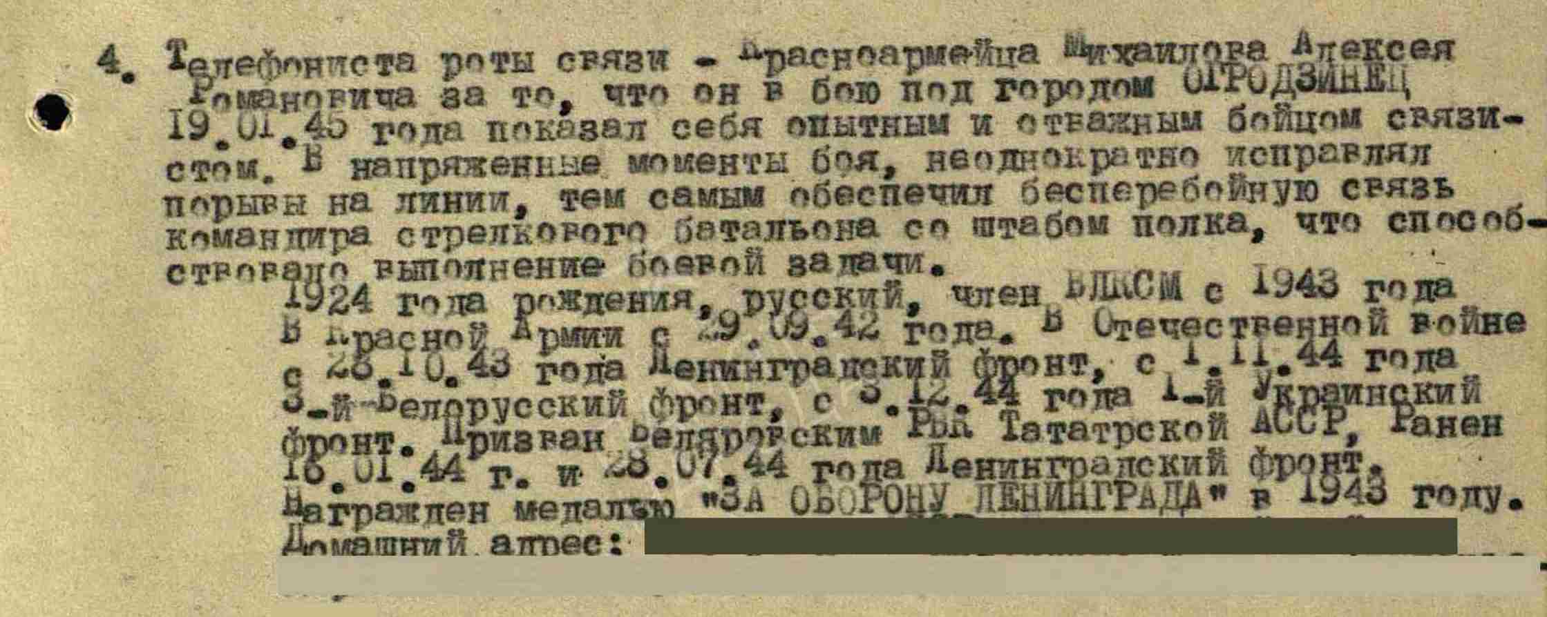 МИХАЙЛОВ Алексей Романович, 1924, д. Александровка. До призыва в армию работал в к-зе «Победитель». Член ВЛКСМ. Мобилизован Билярским РВК 29 сент. 1942. Воевал на Ленинградском, 1 Украинском фронте в составе 55 А/ 23 А/ 67 А/ 59 А/ 2 УдА/ 21 А. Участник прорыва и снятия блокады Ленинграда, освобождения Прибалтики и Польши. Перенёс три ранения. Проходил лечение в ЭГ 927, ЭГ 267, ЭГ 109, г. Ленинград. Красноармеец, стрелок 1078 СП 314 СД/ 952 СП 268 СД/ телефонист роты связи 466 СП 125 СД. Награждён медалями «За оборону Ленинграда», «За отвагу».