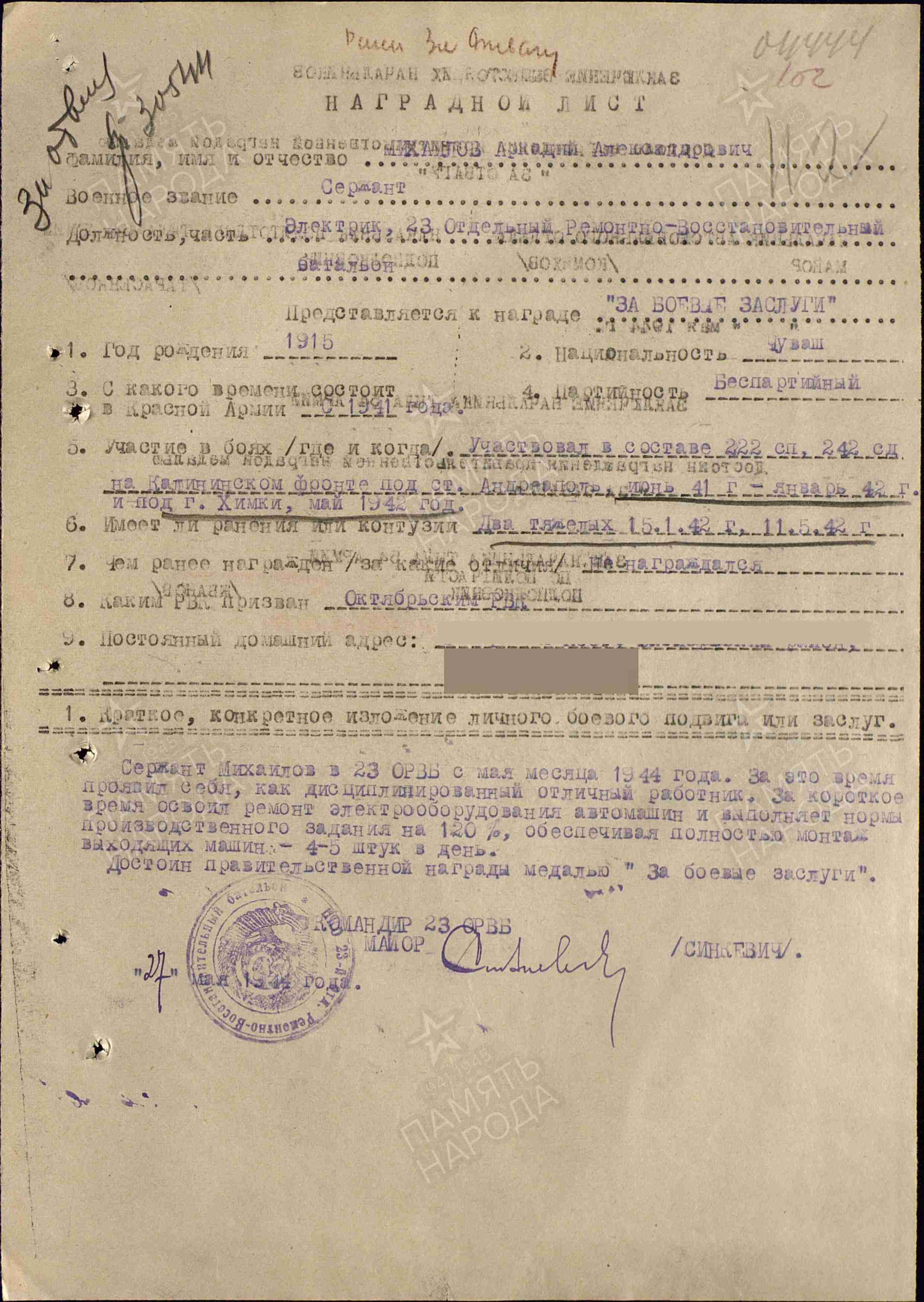 В 02.1942 г. ранило в ступню правой ноги осколком мины в районе ст. Андриополь. До марта 1942 был на излечении в г. Иваново.