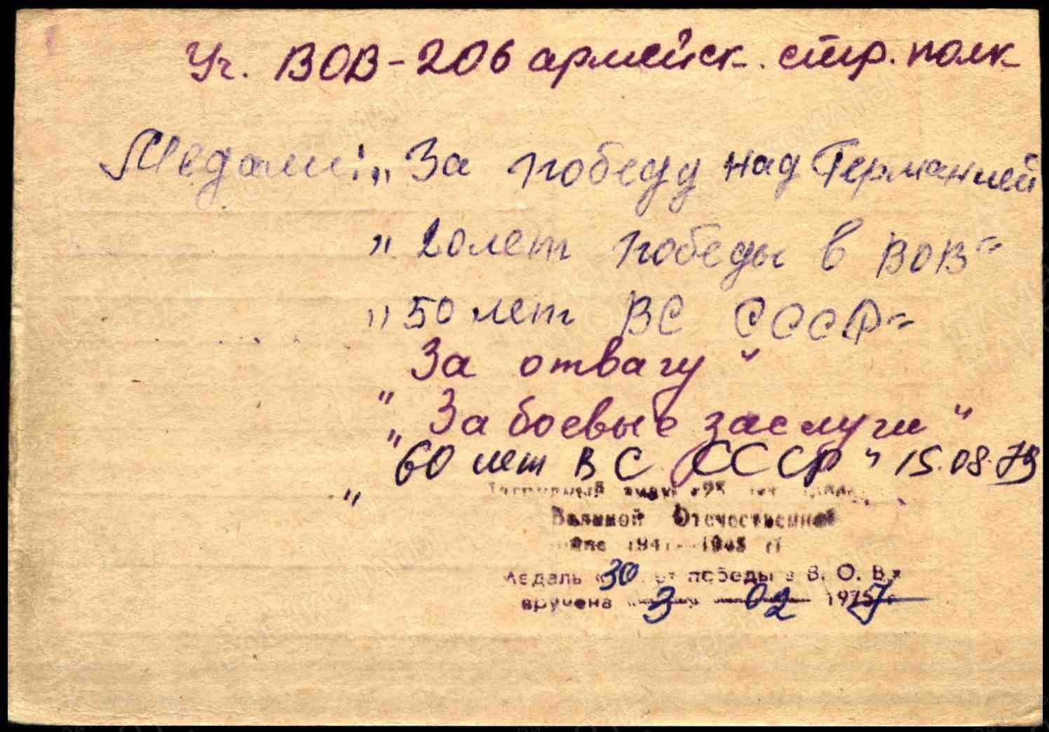 Награжден медалями «За отвагу», «За боевые заслуги», юбилейными.