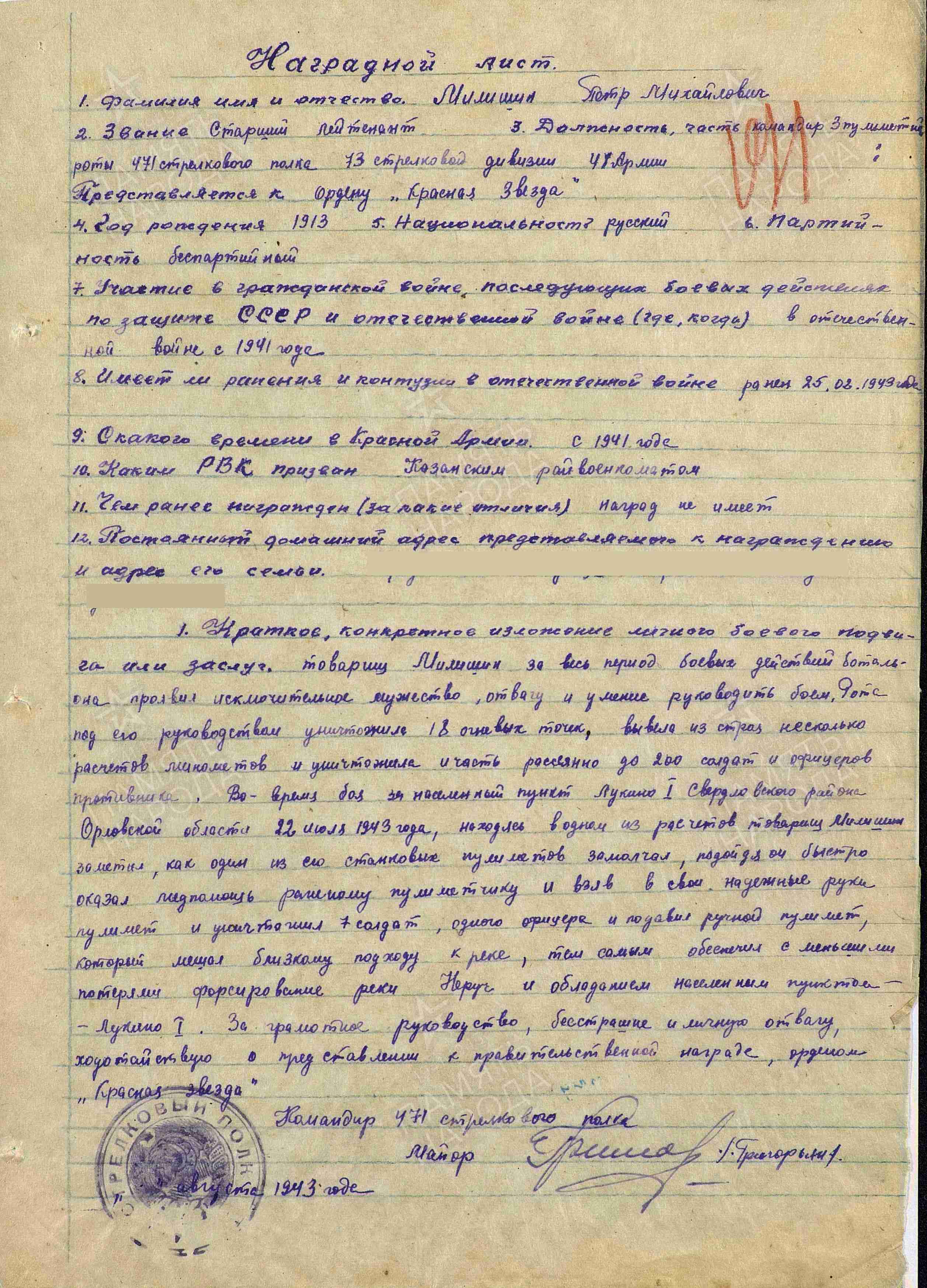 МИЛИШИН Пётр Михайлович, 1913, с. Лебедино. В РККА с 1935. Участвовал в Советско-финляндской войне. Жил в г. Казань, работал автослесарем в Казгордорстрое. Мобилизован Казанским ГВК в 1941. Окончил Ульяновское военно-пехотное училище. Мл. лейтенант, ком. взвода 122 отд. СБр 48 А Брянского фронта, ком. пулемётной роты 471 СП 73 СД 48 А Брянского и Центрального фронта, ст. лейтенант. Участник Курской битвы. «Тов. Милишин в боях проявил исключительное мужество, отвагу и умелое руководство подразделением. Рота под его командованием уничтожила 18 огневых точек, вывела из строя несколько миномётных расчётов, уничтожила и частично рассеяла до 200 солдат и офицеров противника. В ходе боя за н.п. Лукинская Свердловского р-на Орловской обл., 22 июля 1943, заменил раненого пулемётчика, лично уничтожил семь солдат и одного офицера, подавил ручной пулемёт врага, чем обеспечил форсирование реки Неручь нашими подразделениями с наименьшими потерями». Награждён орденом Красной Звезды. С 23 авг. 1943 – капитан. Ранен 3 сент. 1943, умер от ран 9 сент. 1943, д. Мефодовка, Хильчицкий р-н, Сумская обл., УкрССР.