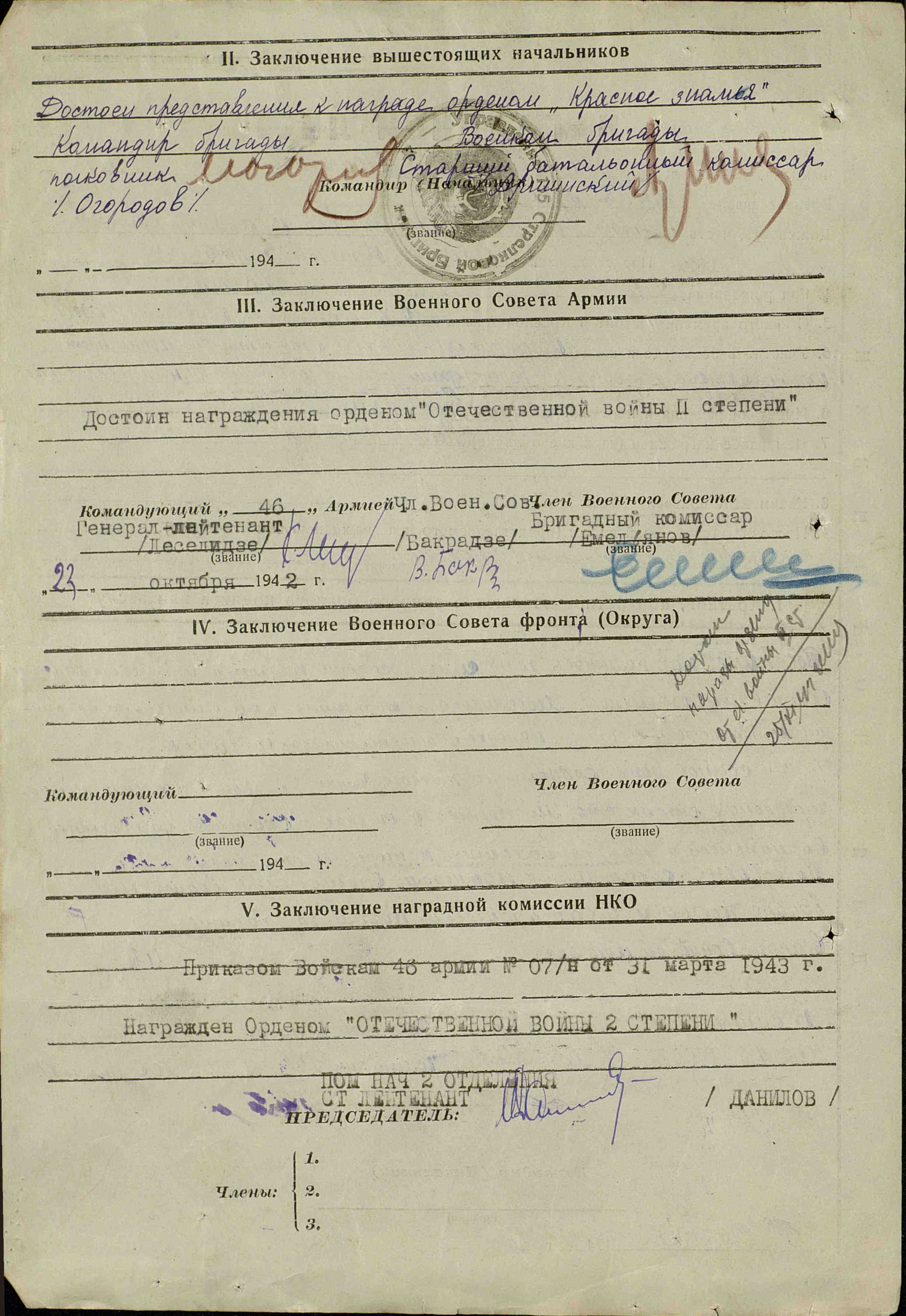 31 марта 1943 года был посмертно награжден орденом Отечественной войны II степени.