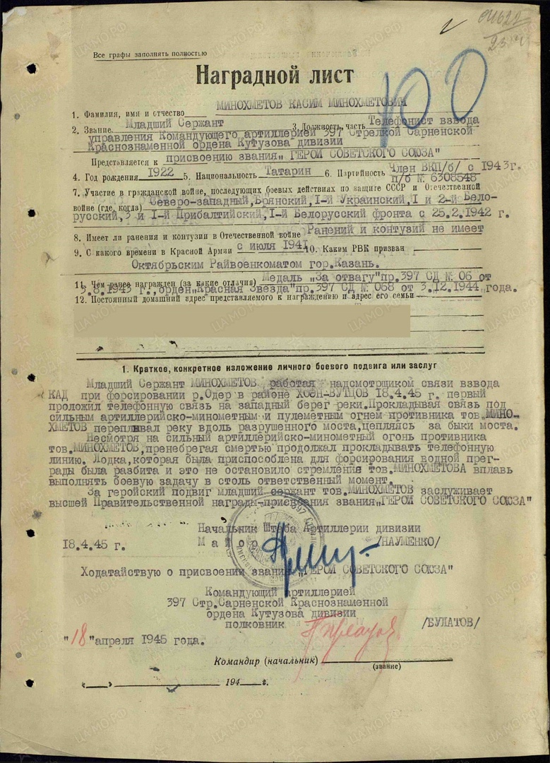 За геройский подвиг тов. Минохметов заслуживает высшей правительственной награды – звания героя Советского Союза». Военный Совет армии утверждает представление о награждении высшей наградой, но последнее слово остается за командующим артиллерией I Белорусского фронта генерал-полковником Казаковым: «Достоин награждения орденом Красное Знамя».