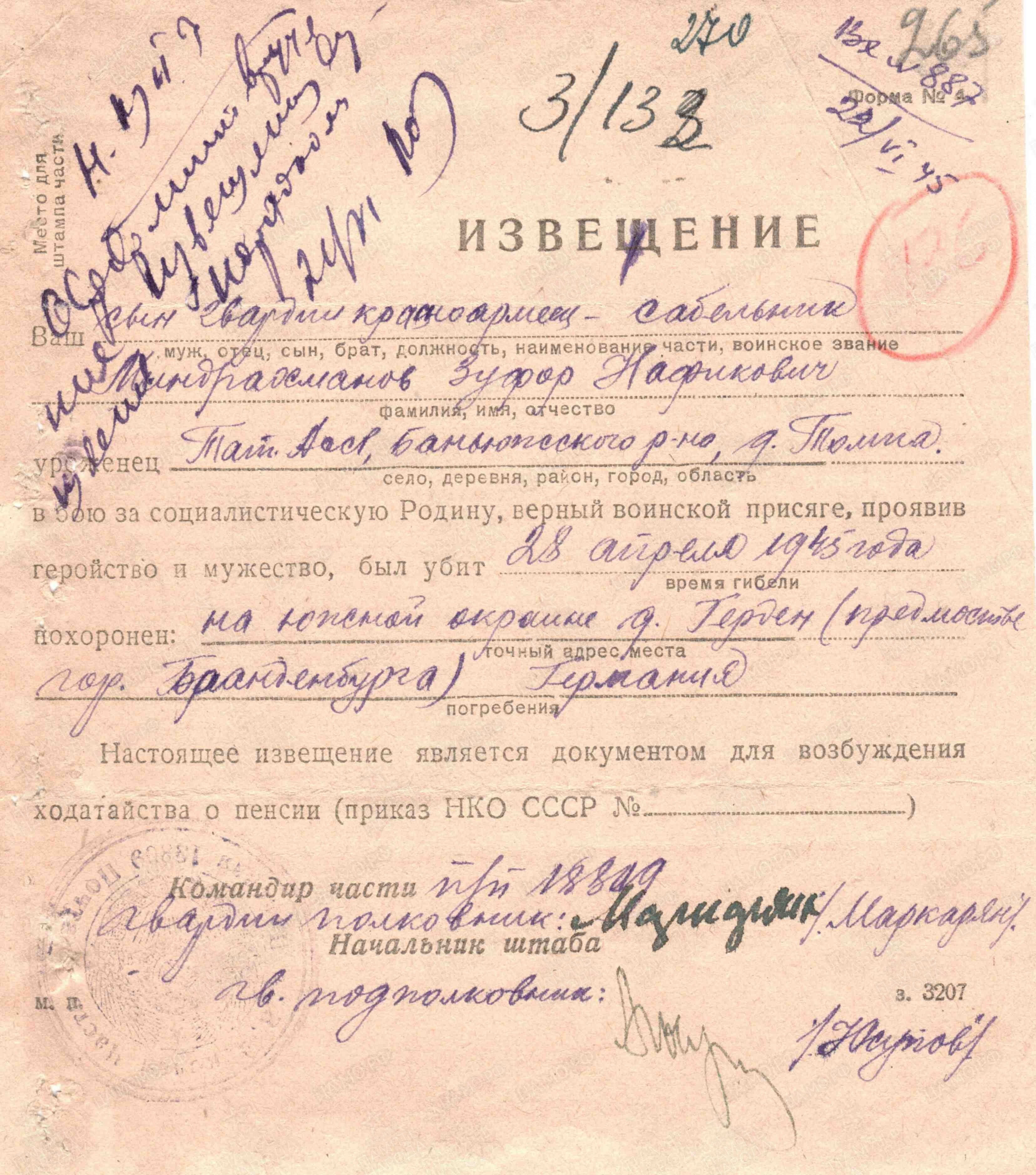 В РККА с 20.09.1942 года. Мобилизован Бондюжским районным военкоматом, Татарская АССР.