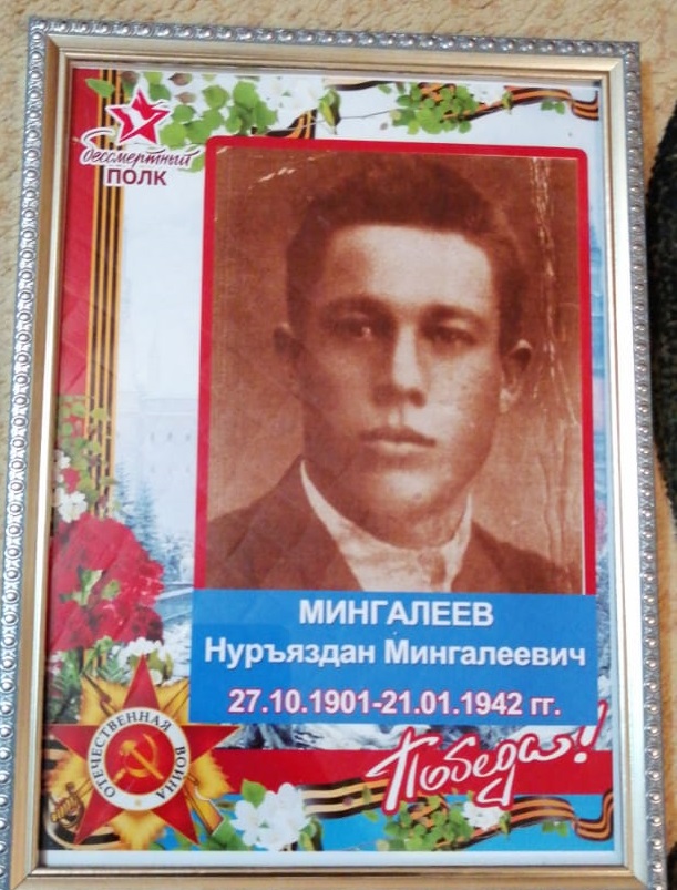 Мингалеев Нуръяздан Мингалеевич (р.1901, с. Шибаши Спасского у. Казан. губ., ныне Алькеевского р-на РТ – 1942), участник Вел. Отеч. войны. В Кр. Армии с 1941 г.(Материал предоставлен Базарно-Матакским сельским поселением Алькеевского района РТ).