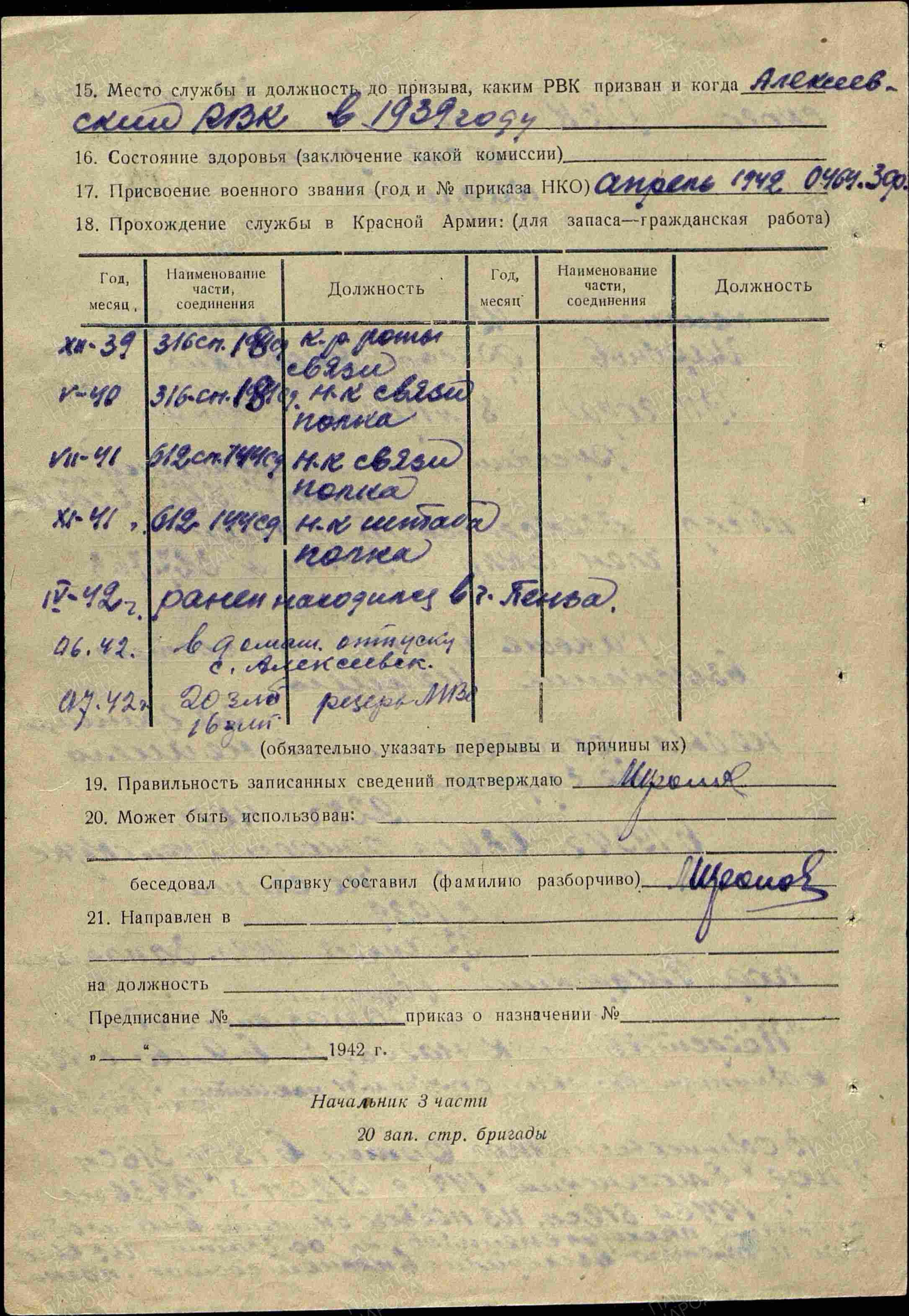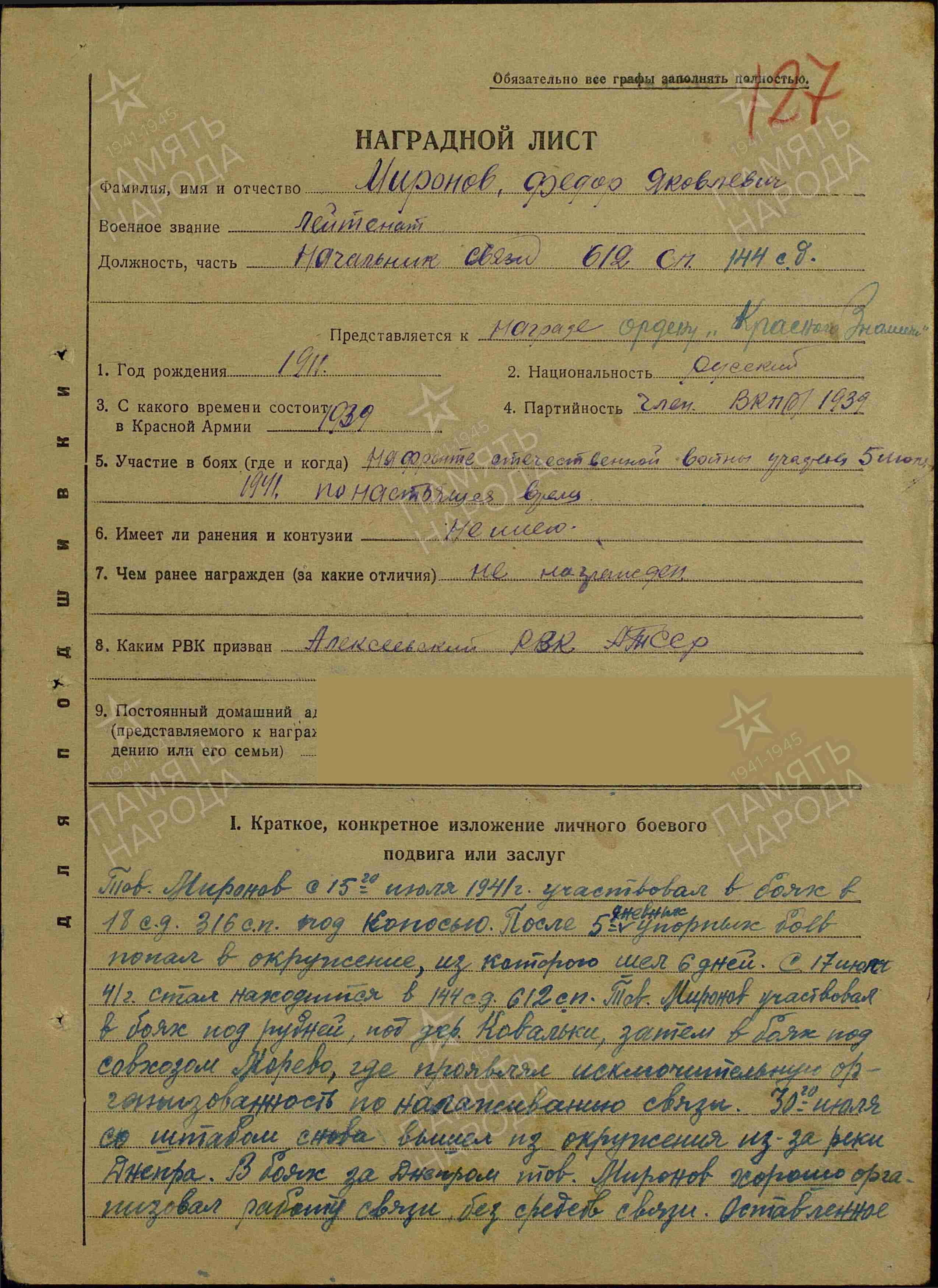МИРОНОВ Фёдор Яковлевич, 1911, с. Мурзиха/д. Кузькино. В РККА с 1934. Кадровый офицер. Член ВКП(б). В 1940 участвовал в Советско-финляндской войне, прошёл курсы усовершенствования ком. состава. В боях с первых дней войны, ком. роты связи 316 СП 18 СД ЗапФ, 612 СП 144 СД 5 А ЗапФ нач. связи, нач. штаба полка. Был трижды в окружении: под Оршей, Смоленском, Вязьмой. Ранен 27 апр. 1942. В 1943-1944 – майор, нач. штаба 454 СП 100 СД 40 А Воронежского и 38 А 1 УкрФ. Награждён медалью «За боевые заслуги», орденами Суворова 3 ст., Красного Знамени. Убит 6 янв. 1944, с. Люленцы, Плисковский р-н, Винницкая обл., УкрССР.