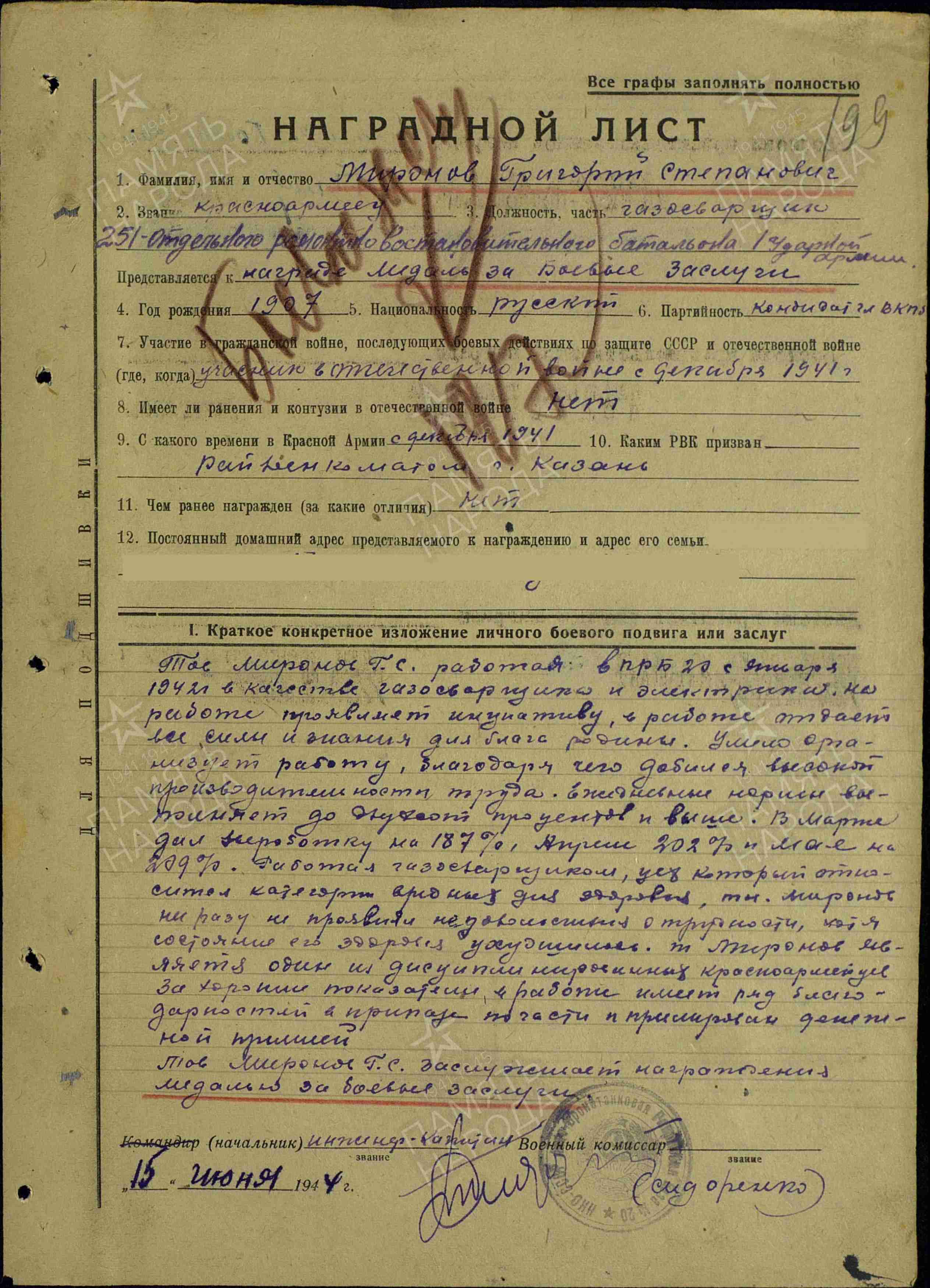 МИРОНОВ Григорий Семёнович (Степанович), 1907, с. Сергиевское. Мобилизован в дек. 1941 из г. Казань. Кандидат ВКП(б). Красноармеец, газосварщик/ электрик 20 полевого ремонтного батальона/ 251 отд. ремонтно-восстановительного батальона автомашин 1 Уд А Западного/ Северо-Западного/ 2 – 3 Прибалтийского/ Курляндской группы войск Ленинградского фронта. Награждён медалью «За боевые заслуги», орденом Отечественной войны 2 ст. (1985).