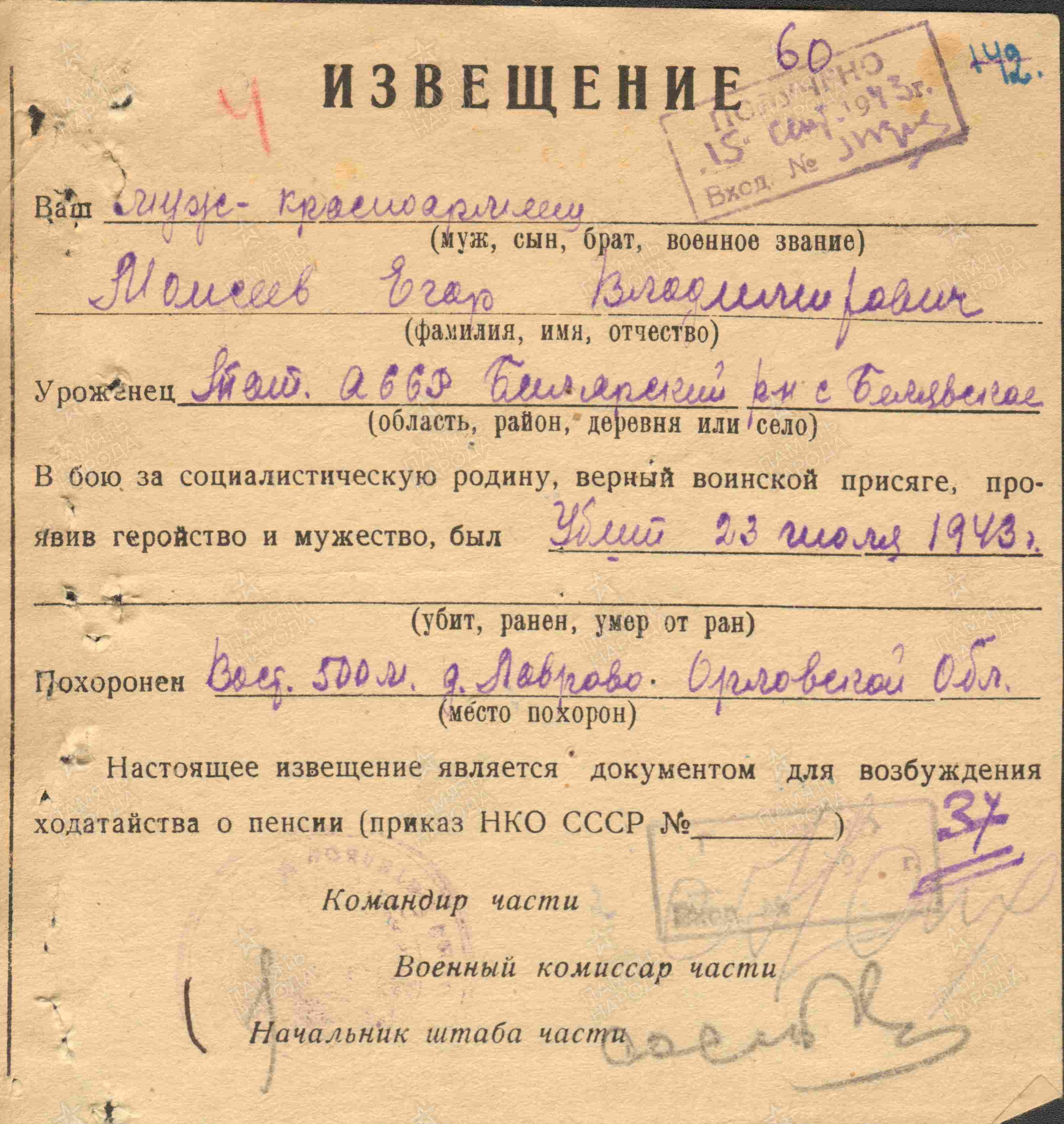 МОИСЕЕВ Егор Владимирович, 1904, с. Билярск. Мобилизован 2 сент. 1941 Алексеевским РВК. Воевал на Северо-Западном и Центральном фронте. Принимал участие в битве на Курской дуге. Красноармеец, сапёр 371 отд. сап. батальона 202 СД 48 А. Погиб 23 июля 1943, д. Лаврово, Курская обл. Увековечен на братском захоронении в д. Рождественское, Троснянский р-н, Орловская обл.