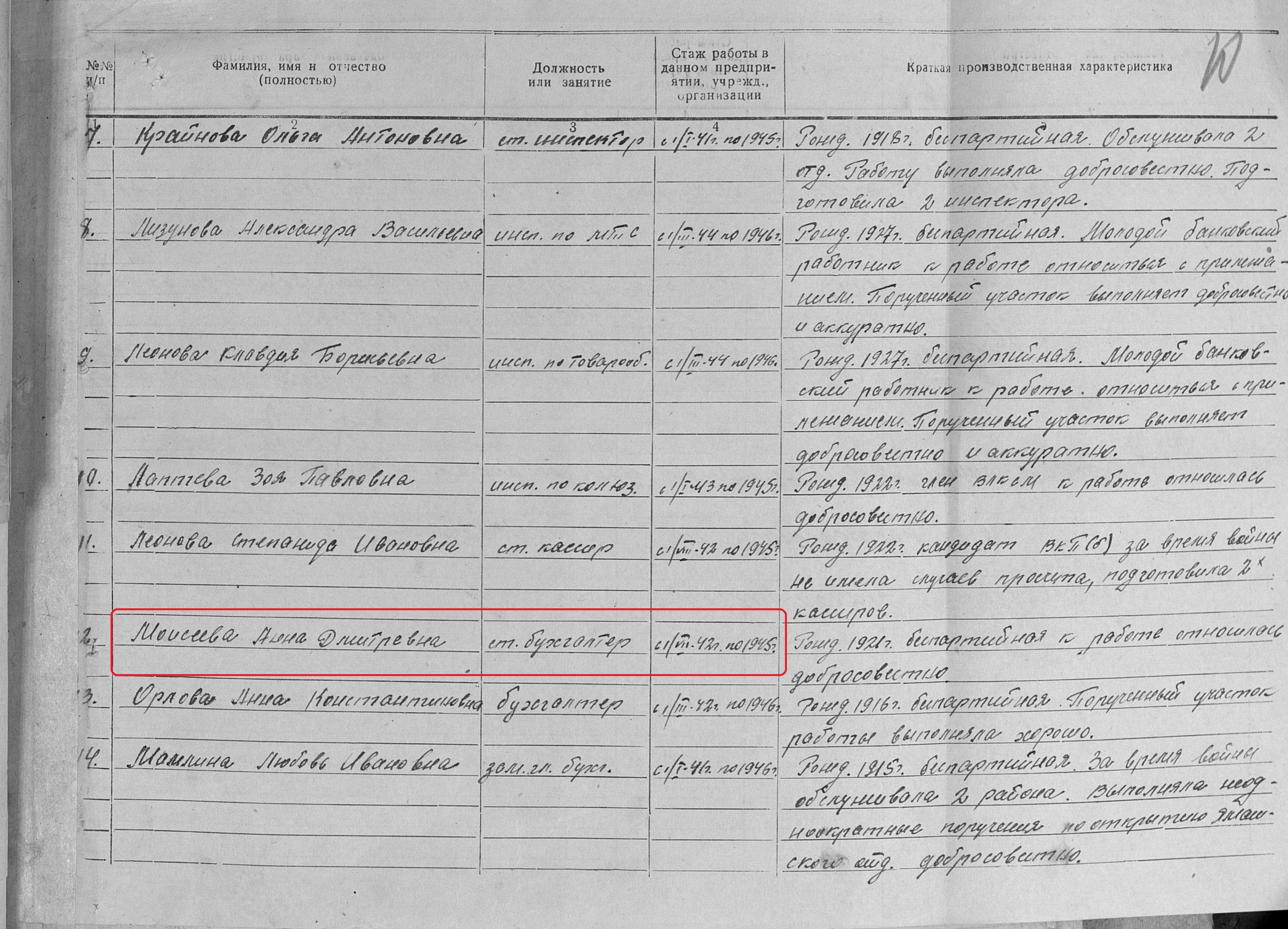 Моисеева Анна Дмитриевна родилась 1918 году. Место жительства: с.Новошешминск Ново-Шешминский район ТАССР. В годы Великой Отечественной войны работала в Отделении Государственного банка старшим бухгалтером. Награждена медалью "За доблестный труд в Великой Отечественной войне 1941–1945 гг." (Акт от 01.1946 г., фонд 3610, опись 2, дело № 174, лист 10).