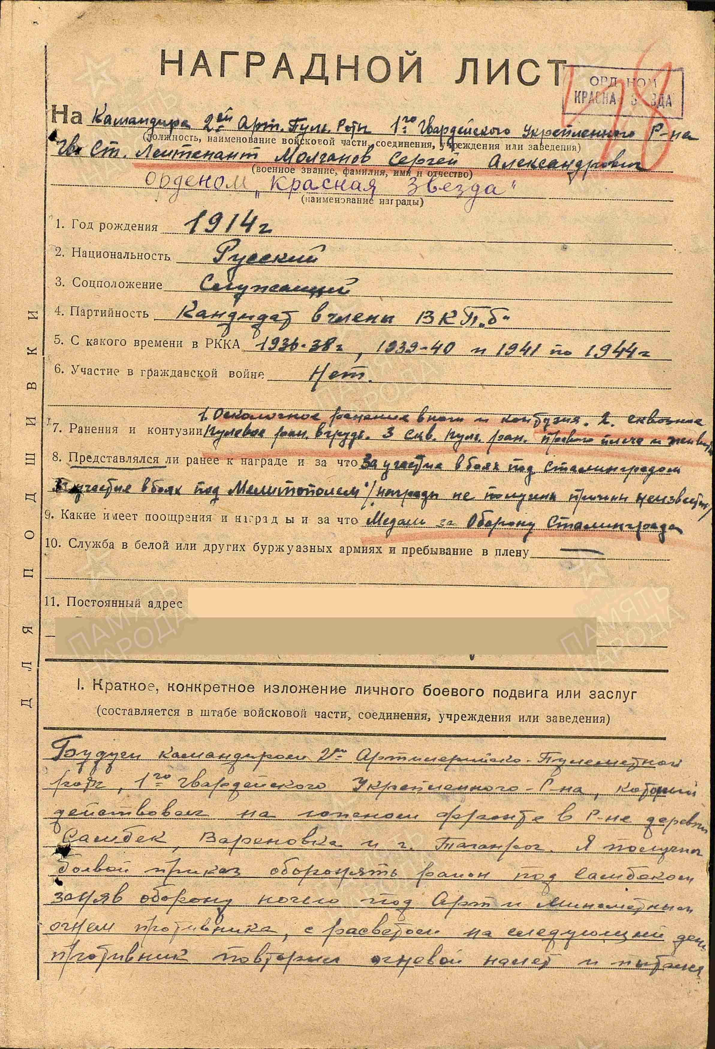 Награжден медалью «За оборону Сталинграда», орденом Красной Звезды (1944).