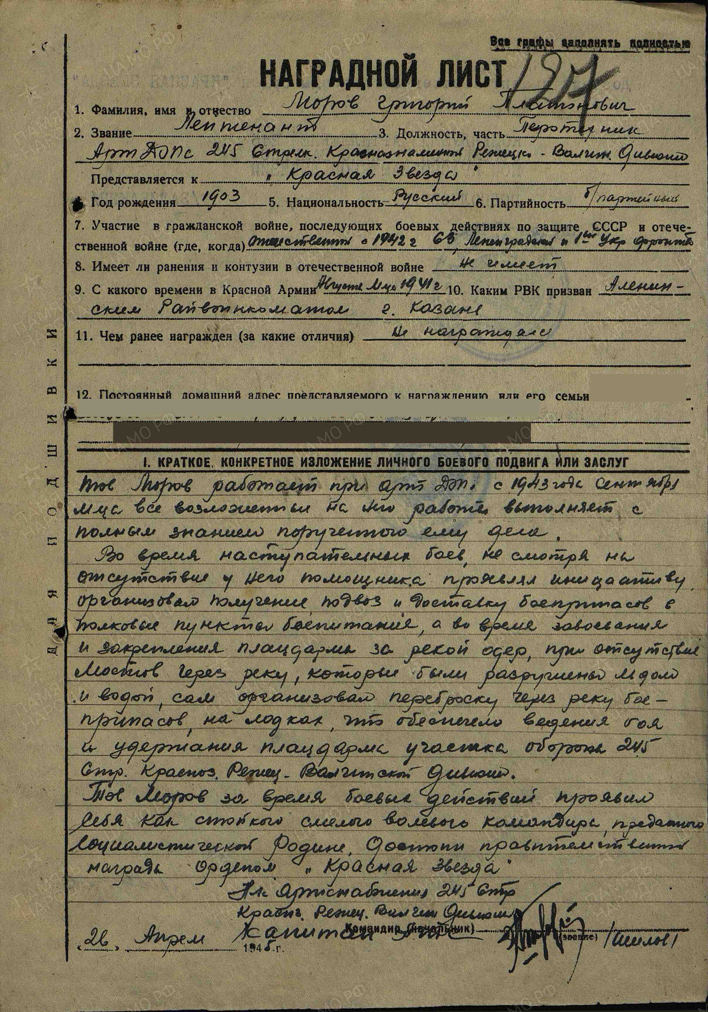 МОРОВ Григорий Платонович, 1903, с. Мурзиха. Мобилизован 26/29 авг. 1941 Ленинским РВК г. Казань. Воентехник 2 ранга. Направлен на воен. склад № 946. С 7 окт. 1942 воевал на Северо-Западном, Ленинградском, 2 и 3 Прибалтийском, 1 Украинском фронте в составе 34 А/ 22 А/ 3 УдА/ 54 А/ 1 УдА/ 59 А. Лейтенант, пиротехник арт. ДОП 245 СД. Участник освобождения Прибалтики, Польши, форсирования Одера. Награждён орденом Красной Звезды. Уволен в запас 9 нояб. 1945.