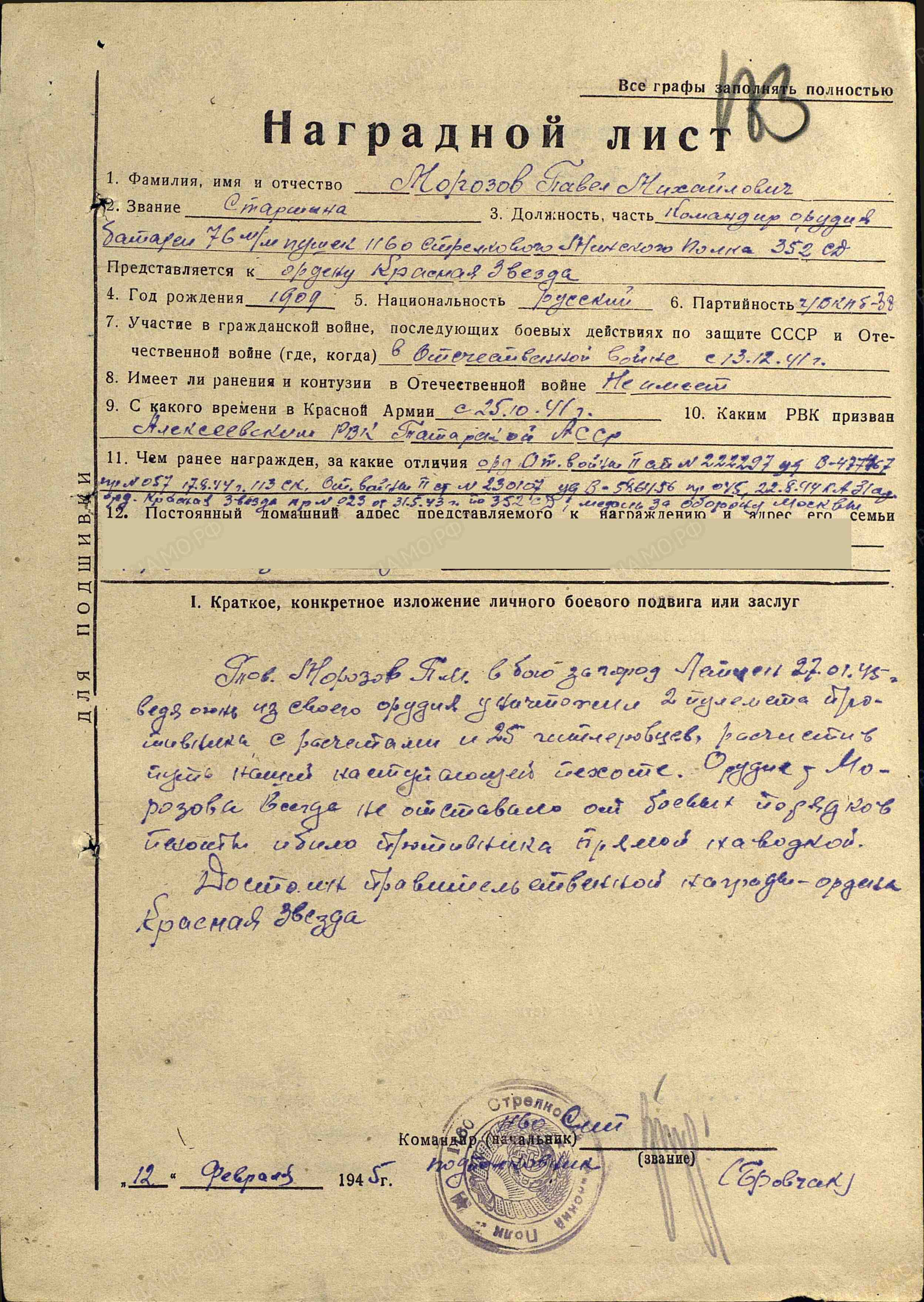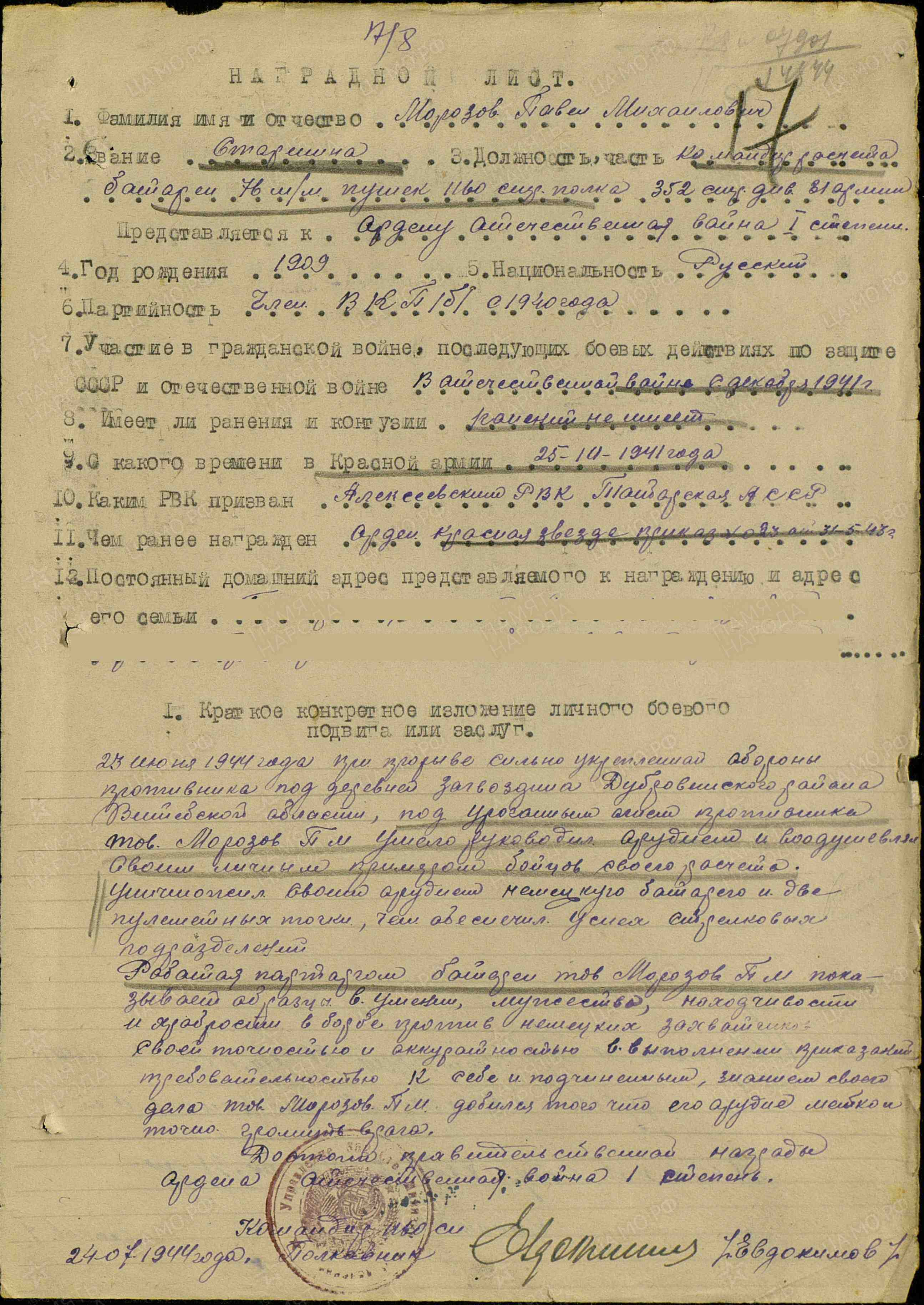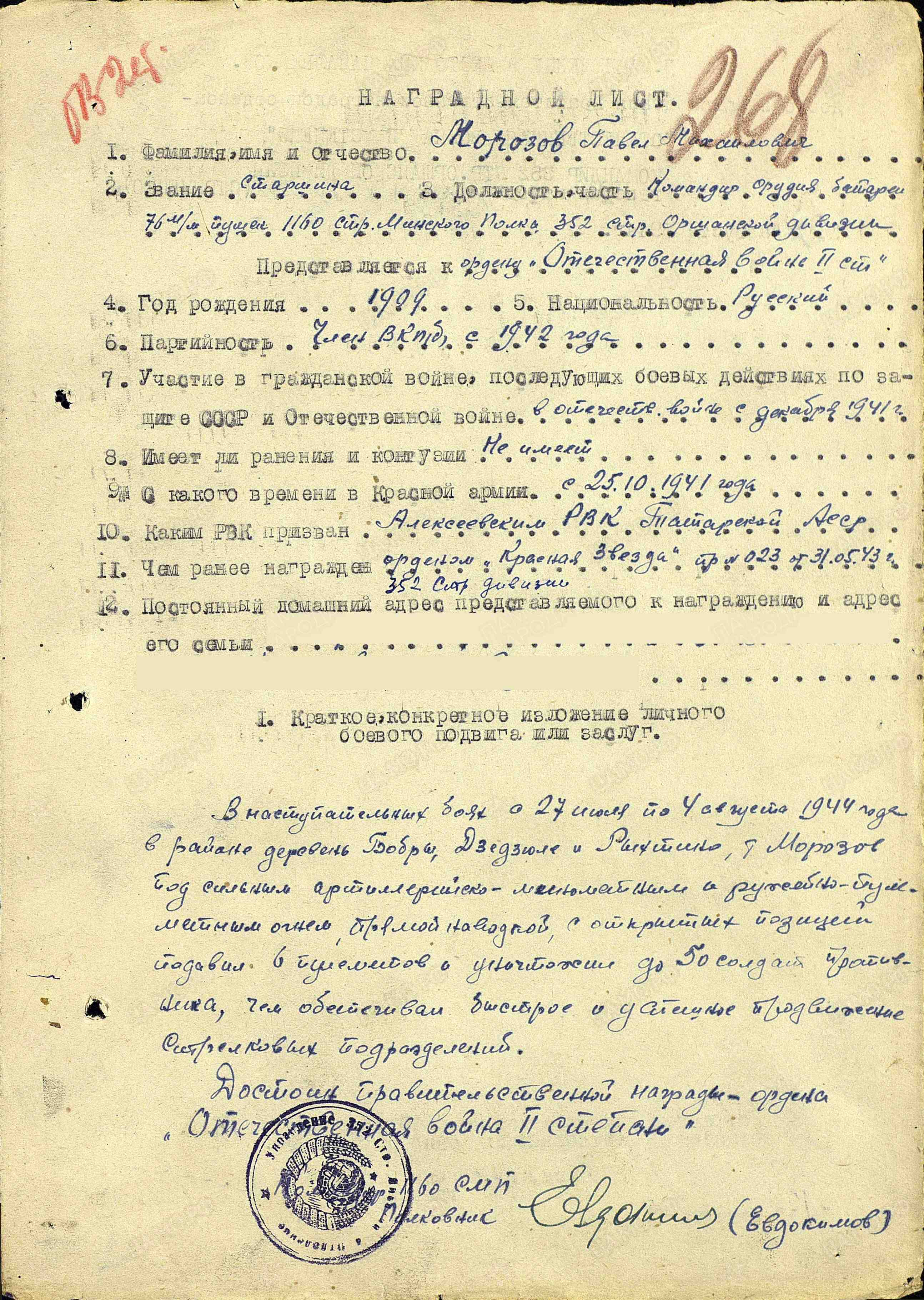МОРОЗОВ Павел Михайлович, 1909, с. Масловка. Мобилизован Алексеевским РВК в 1941г. Старшина, командир орудия батареи 76 мм пушек 1160 СП 352 СД в составе 5 Армии Западного Фр, 113 СК 31 Армии 3 Белорусского фронта. Награждён медалью "За оборону Москвы", двумя орденами Красной Звезды (1943, 1945), двумя орденами Отечественной войны 2 ст. (оба в 1944).