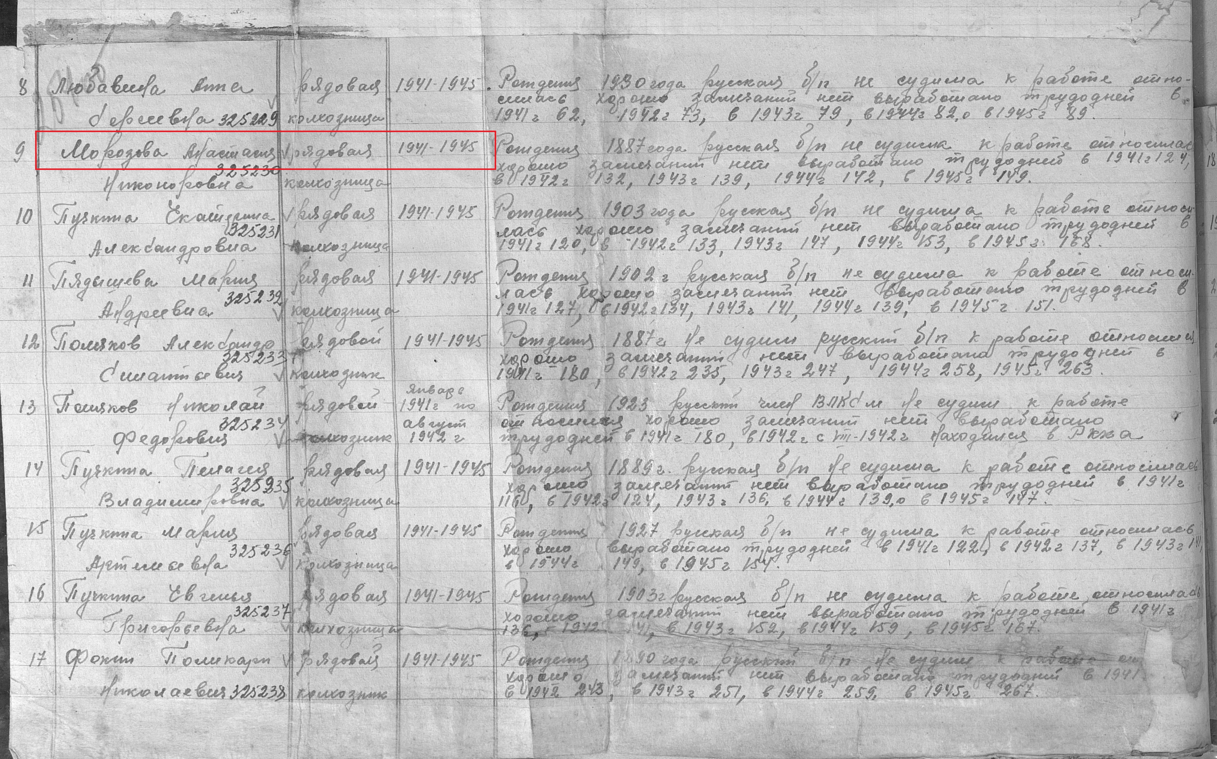 Морозова Анастасия Никитична родилась в 1887 году. Место жительства: д.Дальняя Ивановка Ново-Шешминский район ТАССР (ныне Альметьевский район РТ). В годы Великой Отечественной войны работала в колхозе им.Буденого рядовой колхозницей. Награждена медалью "За доблестный труд в Великой Отечественной войне 1941–1945 гг." (Акт от 20 февраля 1946г., Фонд 3610, опись 2, дело № 470, лист 250, АК № 325230).