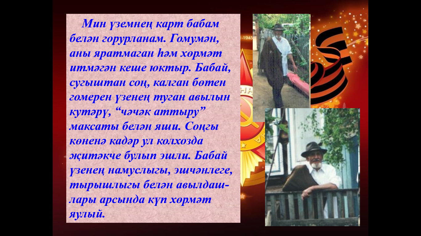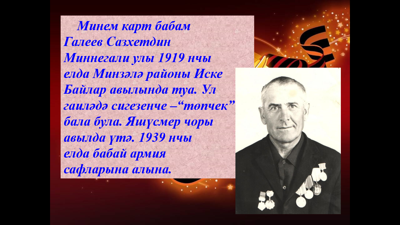 Музей "Преодоление" школы №19 Автозаводского района города Набережные Челны приглашает вас на виртуальную выставку исследовательских работ учащихся "Моя семья причастна к той Победе". Представляем вашему вниманию работу обучающегося 9 класса Мустаева Рината.