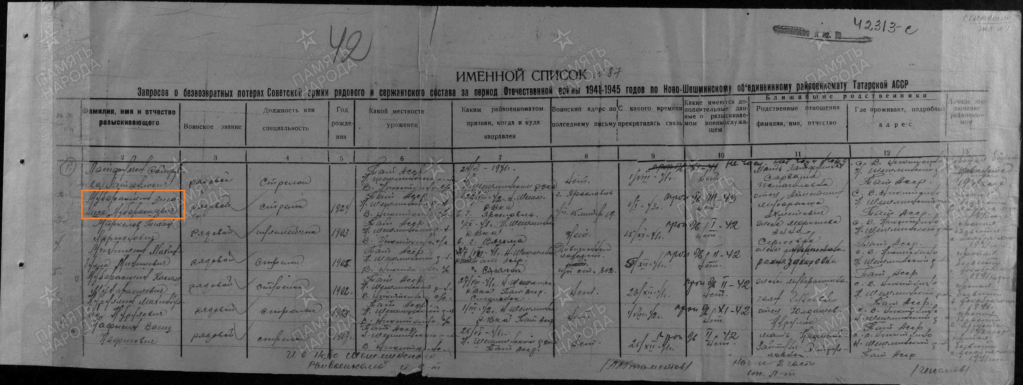 МУБАРАКШИН ЗИГАНША МУБАРАКШЕВИЧ родился в 1924 году в с.Верхнее Никиткино Чистопольского кантона ТАССР (ныне с. Тубылгы-Тау Новошешминского района РТ). Мобилизован Новошешминским РВК. Пропал без вести: 03.43 г.