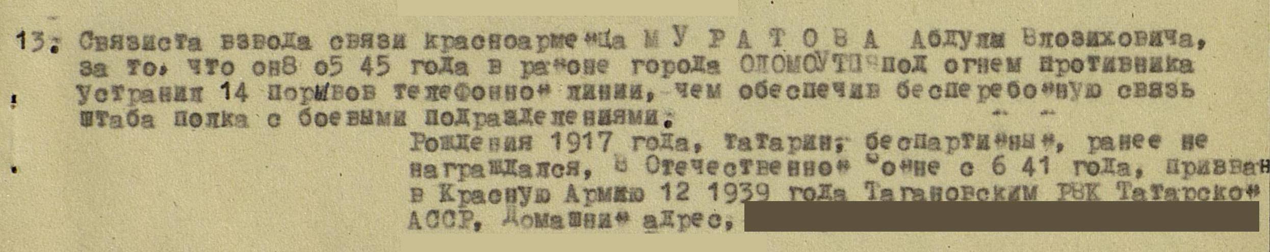 МУРАТОВ Абдулла Вазыхович, 1917, с. Нижние Тиганы. Мобилизован Таканышским РВК в декабре 1939 г. На фронте с первых дней войны. Принимал участие в обороне Кавказа, боях на Таманском полуострове, освобождении Крыма, Севастополя, Болгагии, Чехословакии в составе 900 горно-стрелкового полка 242 горно-стрелковой дивизии в должности связиста взвода связи, красноармеец. В 1945 г. награждён медалью "За отвагу", а также "За победу над Германией", орденом Отечественной войны 2 ст. (1985). После войны работал в колхозе "Алга" разнорабочим. Скончался в 2004 г., похоронен в с. Нижние Тиганы. В базе "Подвиг народа" записан под именеи АБДУЛ ВЛОЗИХОВИЧ/ВАДИХОВИЧ.