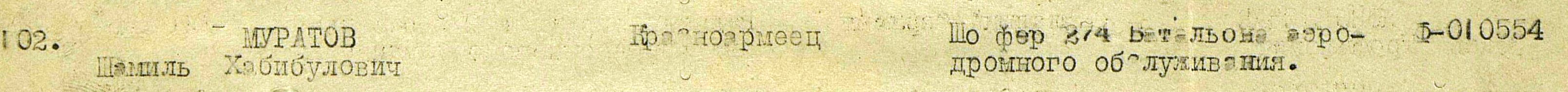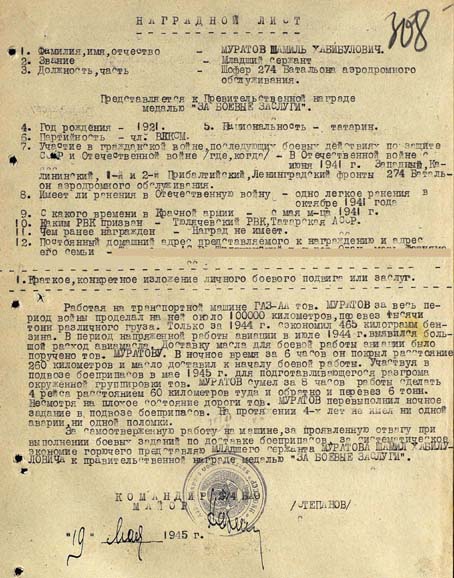 Работая на транспортной машине ГАЗ-АА тов. Муратов за весь период войны проделал на ней около 100 000 километров, перевез тысячи тонн различного груза. Только за 1944 г. сэкономил 165 килограмм бензина. В период напряженной работы авиации в июле 1944 г. выявился большой расход авиамасла. Доставку масла для боевой работы авиации было поручено тов. Муратову. В ночное время за 6 часов он покрыл расстояние 260 километров и масло доставил к началу боевой работы. Участвуя в подвозе боеприпасов в мае 1945 г. для подготавливающегося разгрома окруженной группировки тов. Муратов сумел за 8 часов работы сделать 4 рейса расстоянием 60 километров туда и обратно и перевез 6 тонн. Не смотря на плохое состояние дороги тов. Муратов перевыполнил ночное задание в подвозе боеприпасов. На протяжении 4-х лет не имел ни одной аварии, ни одной поломки.