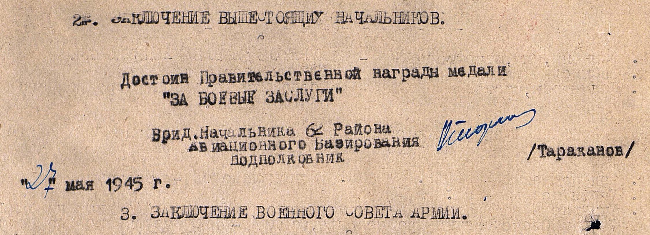 Врид. Начальника 62 Района Авиационного Базирования подполковник Тараканов. 27 мая 1945 г.