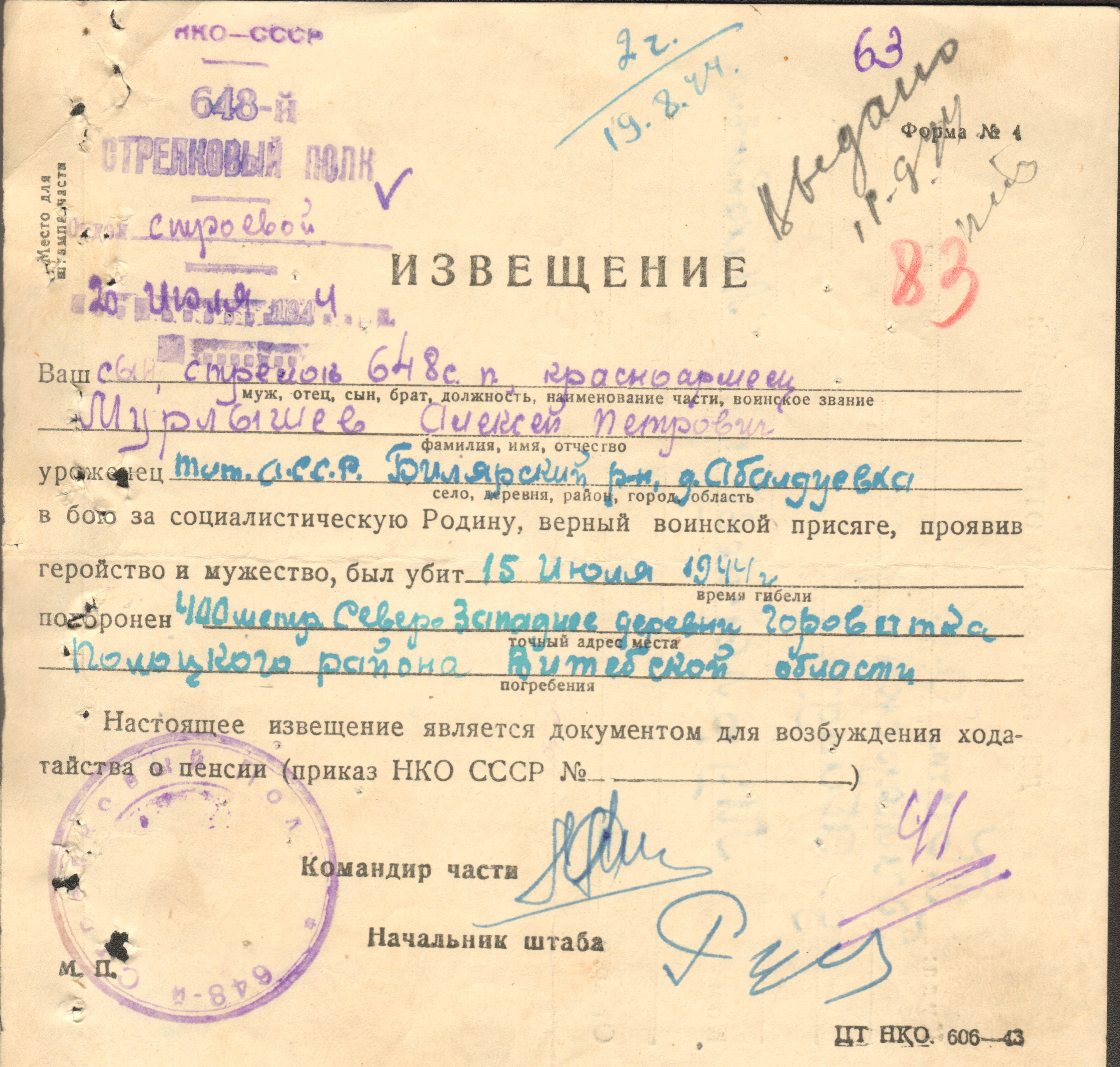 МУРЛЫШЁВ Алексей Петрович, 1926, с. Абалдуевка. Мобилизован Билярским РВК 5 нояб. 1943. Член ВЛКСМ. Красноармеец, стрелок 648 СП 200 СД 2 ПрибФ. 11 июля 1944 при форсировании р. Дрисса после смелой и решительной переправы, под сильным и арт. огнём противника, участвовал в отражении трёх контратак. При переходе в атаку первым бросился на врага, нанося ему урон гранатами и штыком. Награждён орденом Славы 3 ст. приказом по 200 СД от 12 авг. 1944. Погиб 15 июля 1944, д. Гороватка, Полоцкий р-н, Витебская обл., Белорусская ССР.