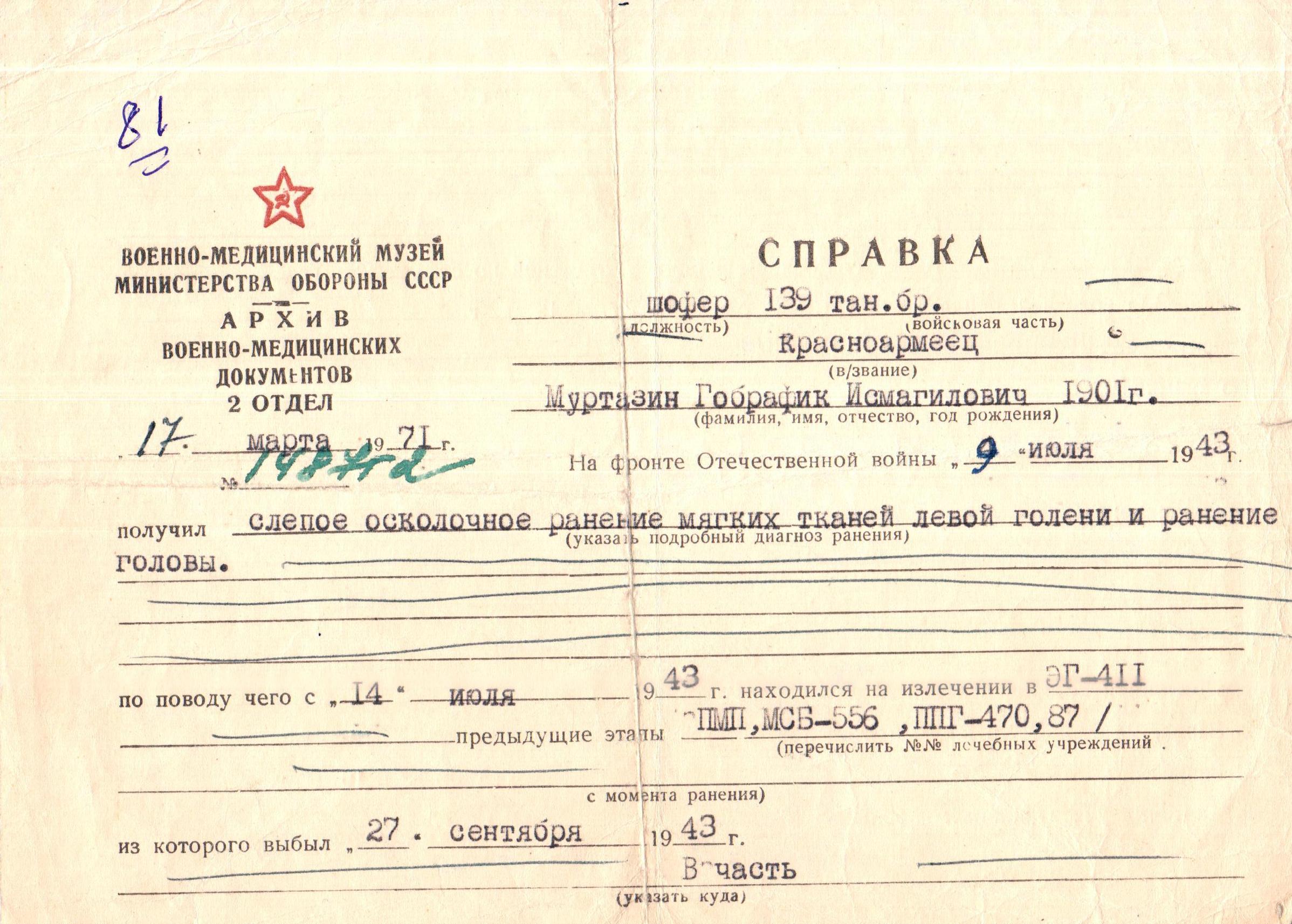 9 июля 1943 г. получил слепое осколочное ранение мягких тканей левой голени и ранение головы, проходил лечение в эвакогоспитале -411. После ранения вернулся в военную часть.