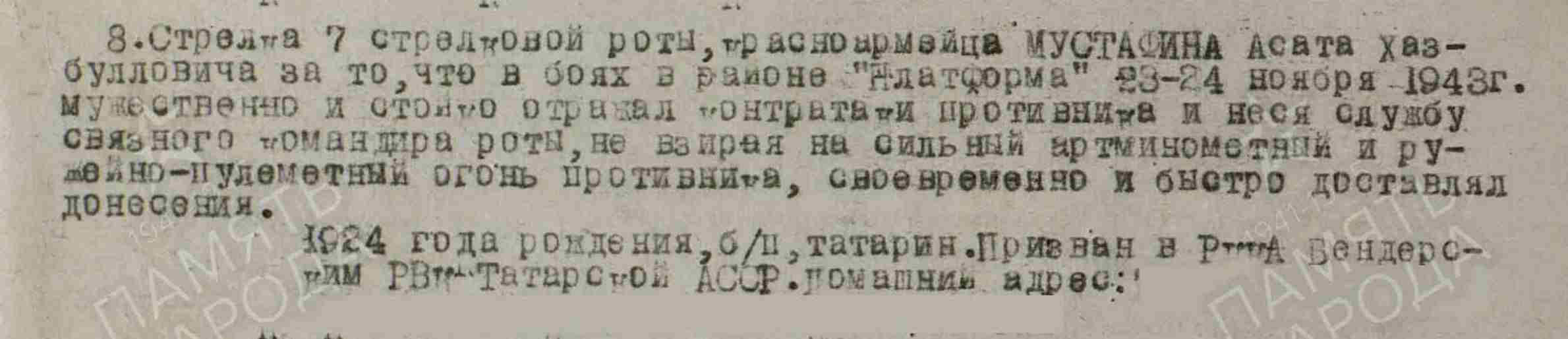 МУСТАФИН Асад Хизбуллович, 1924, с. Большие Тиганы. До призыва в армию работал в к-зе им. Молотова. Мобилизован Билярским РВК в авг. 1942. С 16 янв. 1943 воевал на Ленинградском фронте. Красноармеец/ ефрейтор, стрелок, связной ком. роты 456 СП/ 602 СП 109 СД 42 А/ 2 УдА. Награждён медалями «За оборону Ленинграда», «За отвагу». 13 фев. 1944 получил ранение и выбыл в ЭГ 1114, г. Ленинград.