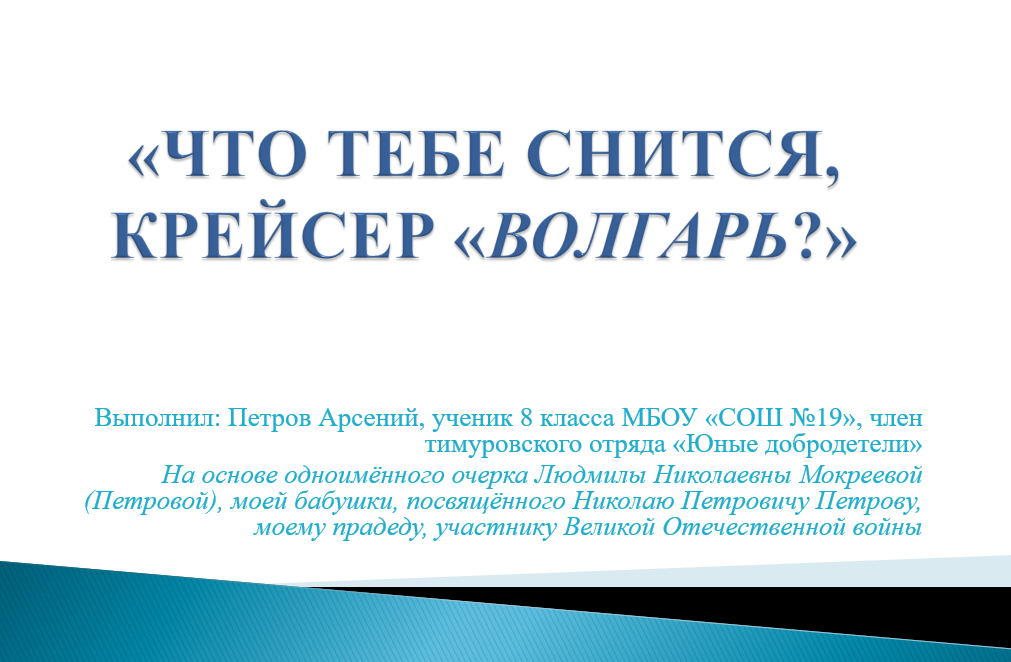 Музей "Преодоление" школы №19 Автозаводского района города Набережные Челны приглашает вас на виртуальную выставку исследовательской работы учащегося 8 класса Петрова Арсения «ЧТО ТЕБЕ СНИТСЯ, КРЕЙСЕР «ВОЛГАРЬ?», посвященную 75-летию Победы в Великой Отечественной войне.