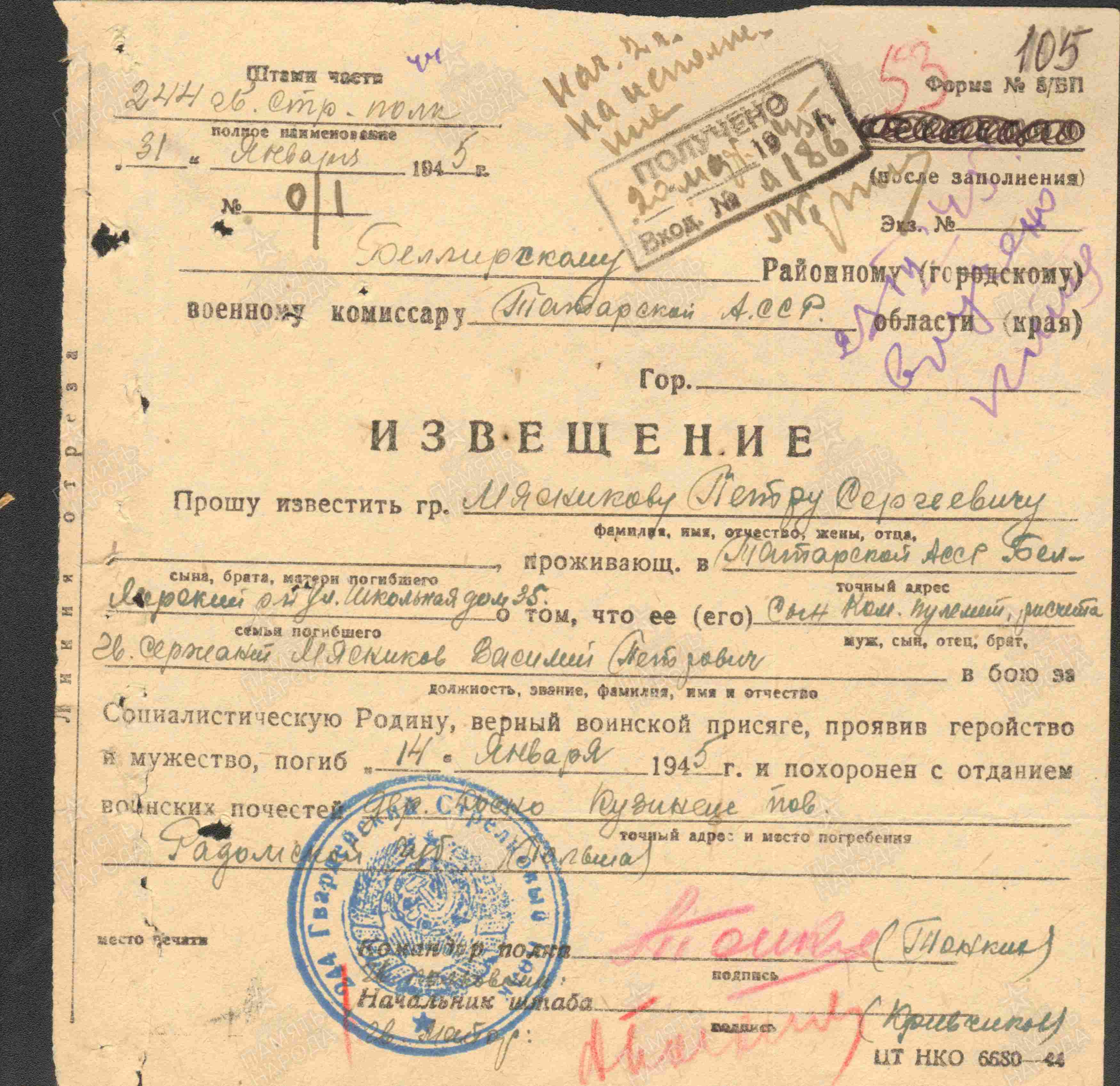 МЯСНИКОВ Василий Петрович, 1922, с. Билярск. Мобилизован из ИТК 1/4 сент. 1943 Пастуховским РВК г. Ижевск УдмАССР. Член ВЛКСМ. Воевал на 3 Украинском и 1 Белорусском фронте в составе 8 гв. А. Участник освобождения Украины и Польши. Гв. сержант, ком. пулемётного расчёта 244 гв. СП 82 гв. СД. Погиб 14 янв. 1945 близ г. Радом, Мазовецкое в-во, Польша.
