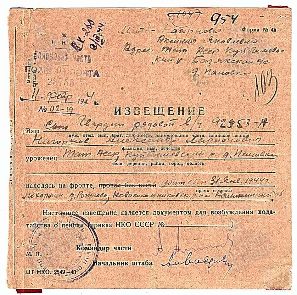 НАГОРНОВ Александр Ларионович, 1925, д. Пановка. Мобилизован Куйбышевским РВК 10 янв. 1943. Гв. красноармеец, 56 гв. СД 10 гв. А Западного и 2 Прибалт. фронта. Убит 30 янв. 1944, д. Рожново, Новосокольнический р-н, Псковская обл.