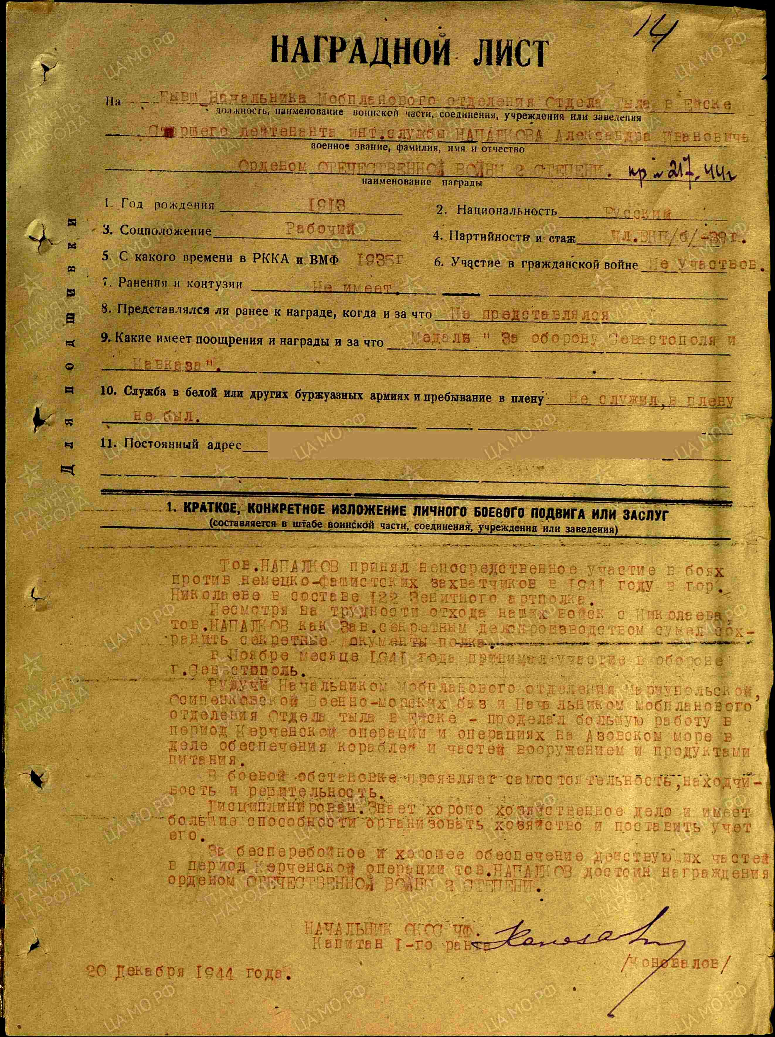 НАПАЛКОВ Александр Иванович, 1913, с. Сахаровка. Призван в РККА 15 нояб. 1935 Казанским ГВК. Кадровый офицер. Ст. лейтенант интендантской службы, зав. секретного делопроизводства 122 ЗенАП Южного фронта, нач. мобилизационно-планового отделения Мариупольской военно-морской базы Черноморского флота, нач. моб. план. отделения тылового Отдела штаба ЧФ. Принимал участие в обороне Севастополя и в боях за Кавказ. Вышел в отставку 23 апр. 1958 в звании «майор интендантской службы». Награждён медалями «За оборону Севастополя», «За оборону Кавказа», «За боевые заслуги» (1946), двумя орденами Отечественной войны 2 ст. (1944, 1985), орденами Красной Звезды (1951), Красного Знамени (1956).