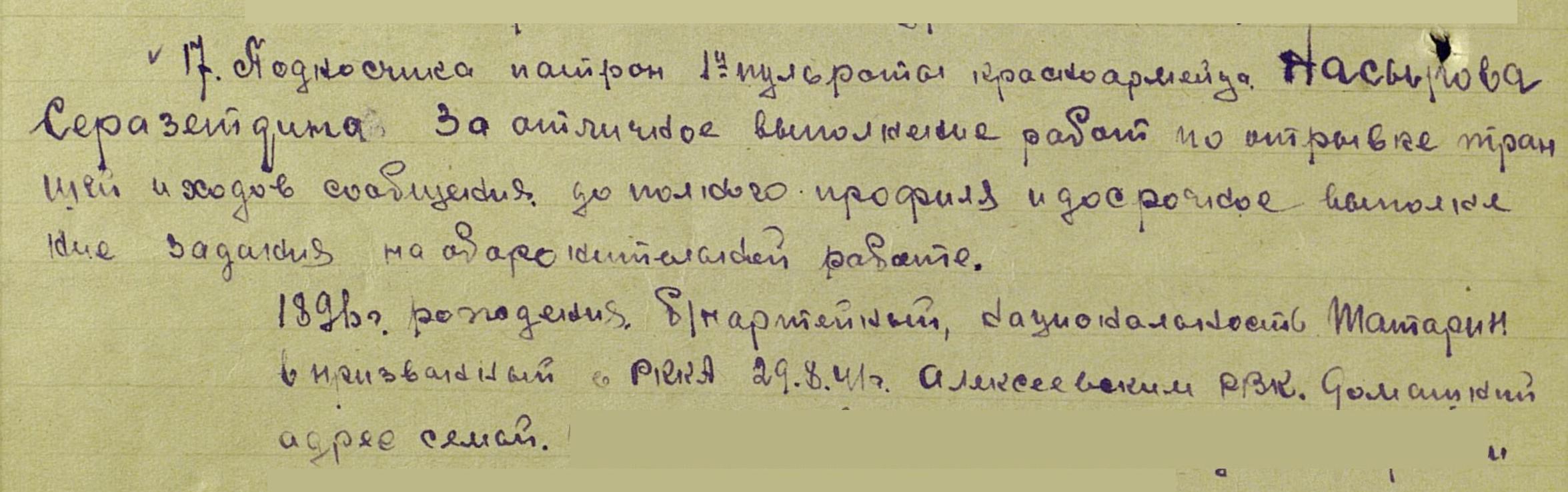 НАСЫРОВ Серазетдин Насырович, 1896, с. Сухие Курнали. По словам родственников участвовал в двух войнах, вероятно в Гражданскую. На Великую Отечественную войну мобилизован Алексеевским РВК 28 августа 1941 г. Красноармеец, подносчик патронов пулемётной роты 681 стрелкового полка 133 стрелковой дивизии Западного Фронта. В августе 1943 г. награждён медалью "За боевые заслуги". В ходе войны был ранен. 7 сентября получил множественные осколочное ранение мягких тканей левой лобно-височной области черепа, мягких тканей левого предплечья, левой половины грудной клетки с переломом 3-го ребра, был на излечении с 7.09.43 по 28 февраля 1944 в ЭГ 1448 Ленинград.С фронта вернулся в родное село, затем в 1950 или 1960-х годах уехал в Таджикскую ССР, г. Алмалык, где умер в 1974г. Фото ветерана предоставила внучка - Лилия Абдуллазянова.