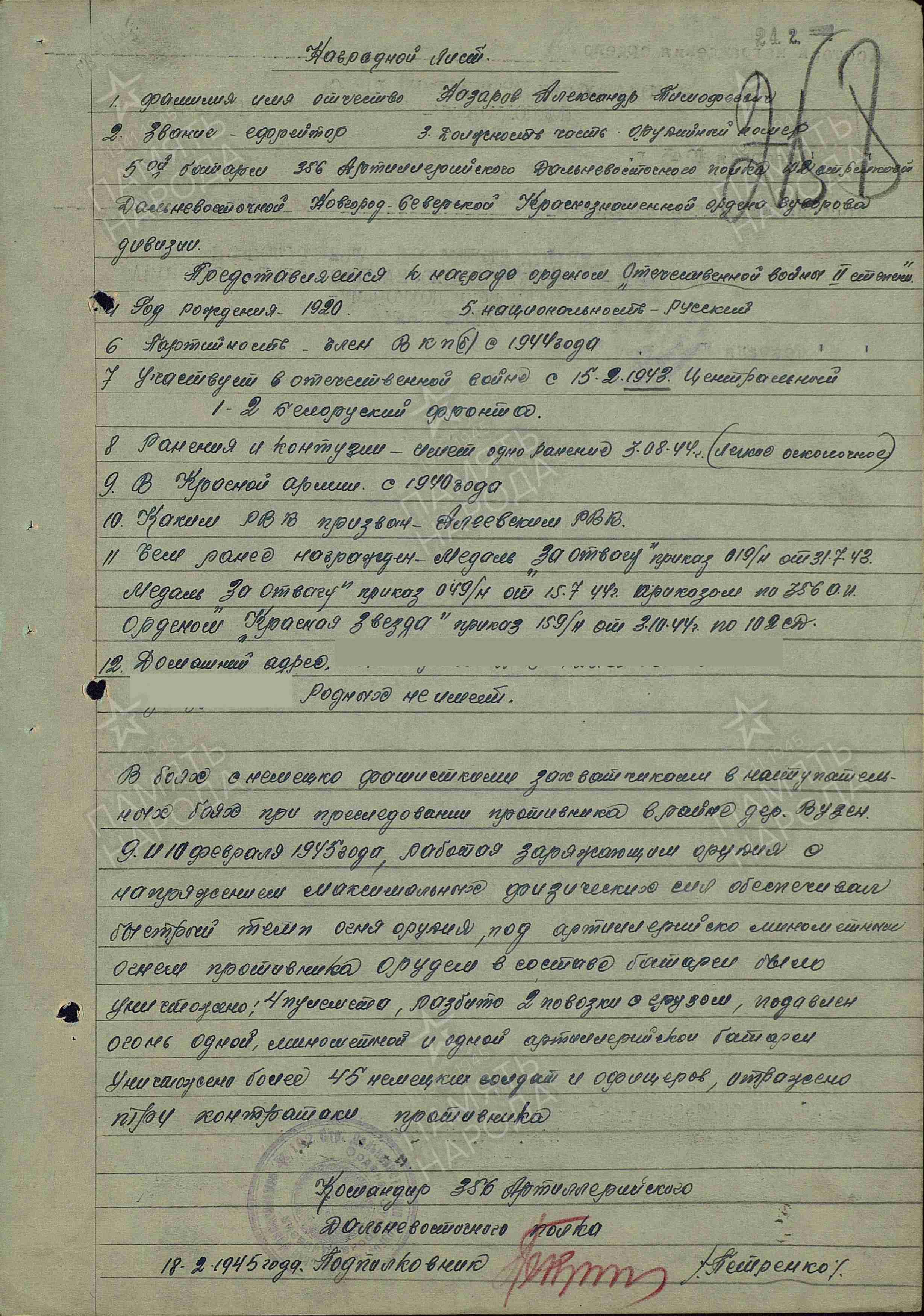 НАЗАРОВ Александр Тимофеевич, 1920, д. Гурьевка. Призван в Красную Армию Кизеловским РВК Молотовской обл. (Пермский край) 5 мая 1939. Ошибочно учтён пропавшим без вести в 1941. По наградным документам – мобилизован в 1941 Алексеевским РВК. Воевал с 15 фев. 1943 на Центральном, Белорусском, 1, 2, 3 Белорусском фронте в составе 70 А/ 48 А. Член ВЛКСМ/ ВКП(б). Ефрейтор, ст. телефонист/ ст. разведчик/ орудийный номер батареи 356 АП 102 СД. Участник битвы на Курской дуге, освобождения Белоруссии, Польши, боёв в Вост. Пруссии. Перенёс лёгкое осколочное ранение 3 авг. 1944. Награждён двумя медалями «За отвагу», орденами Красной Звезды (1944), Отечественной войны 2 ст. (1945).