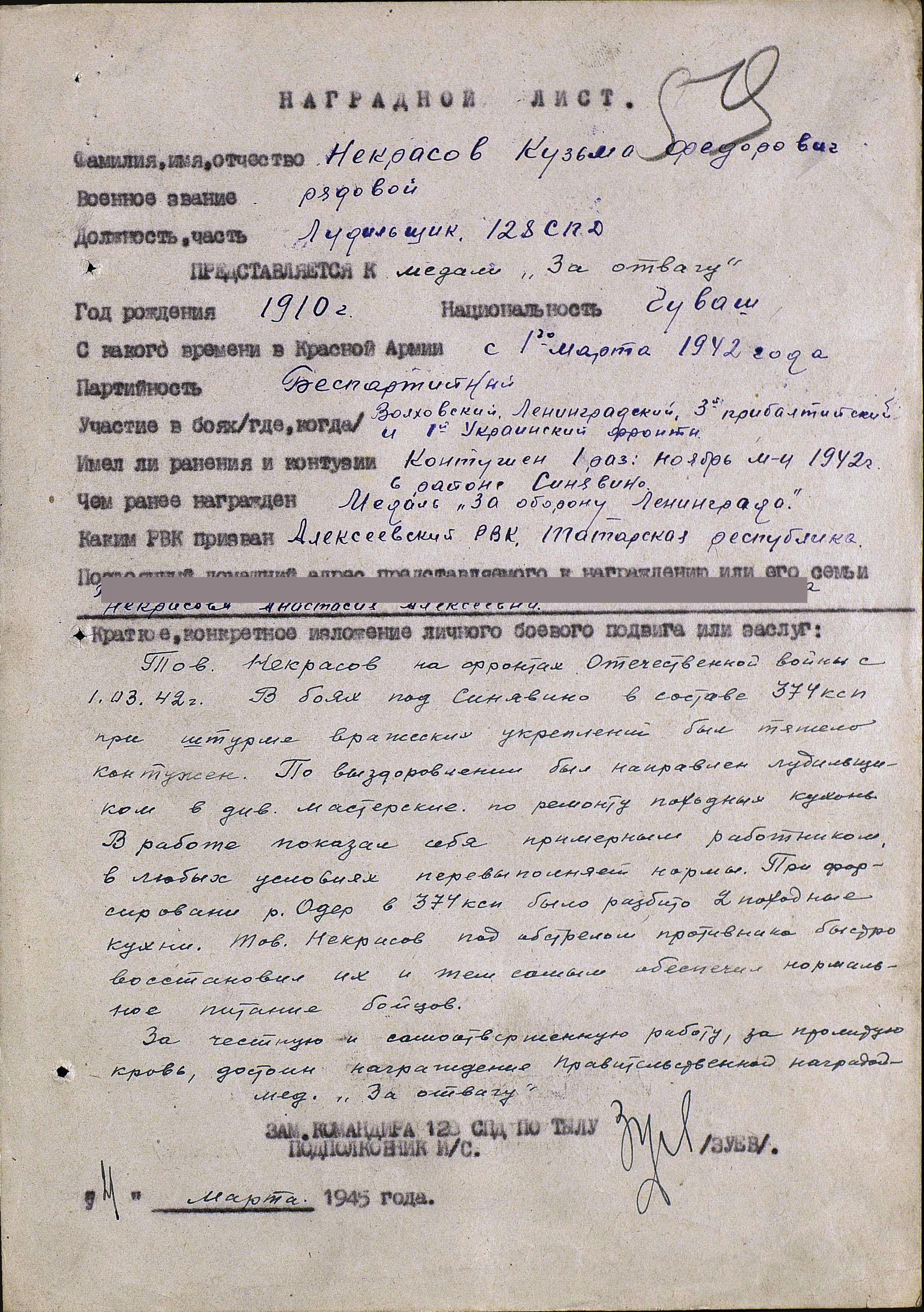 НЕКРАСОВ Кузьма Фёдорович, 1910, Чувашия. В конце 1920-х гг. семья вместе с другими переселенцами переезжает в Алексеевский район в пос. Калининский возле села Караваево. Мобилизован 1 марта 1942 г. Алексеевским РВК. Красноармеец, стрелок 347 стр. полка 128 стр. дивизии. Воевал на Волховском, Ленинградском, 3 Прибалтийском, 1 Укр. фронтах. В ноябре 1942 г. был тяжело контужен в бою. Переведён на службу в дивизионные мастерские лудильщиком по ремонту полевых кухонь, 741 стр. полк. Награждён медалями "За оборону Ленинграда", "За отвагу", "За победу над Германией", орденом Отечественной войны 2 ст. (1985). После войны работал слесарем на Алексеевском молочно-консервном комбинате, был передовиком производства. Скончался в 1985 г., похоронен в с. Алексеевское.
