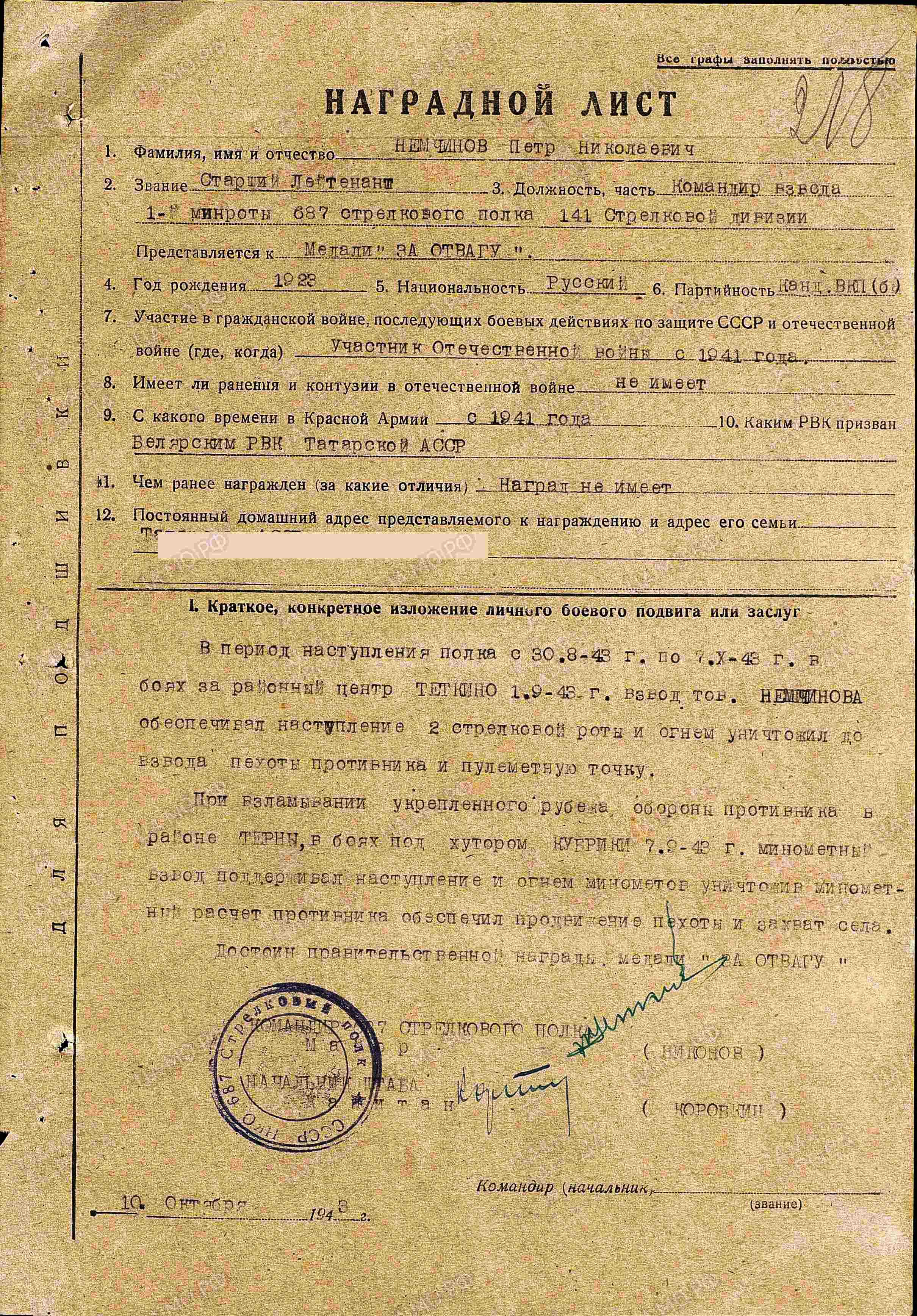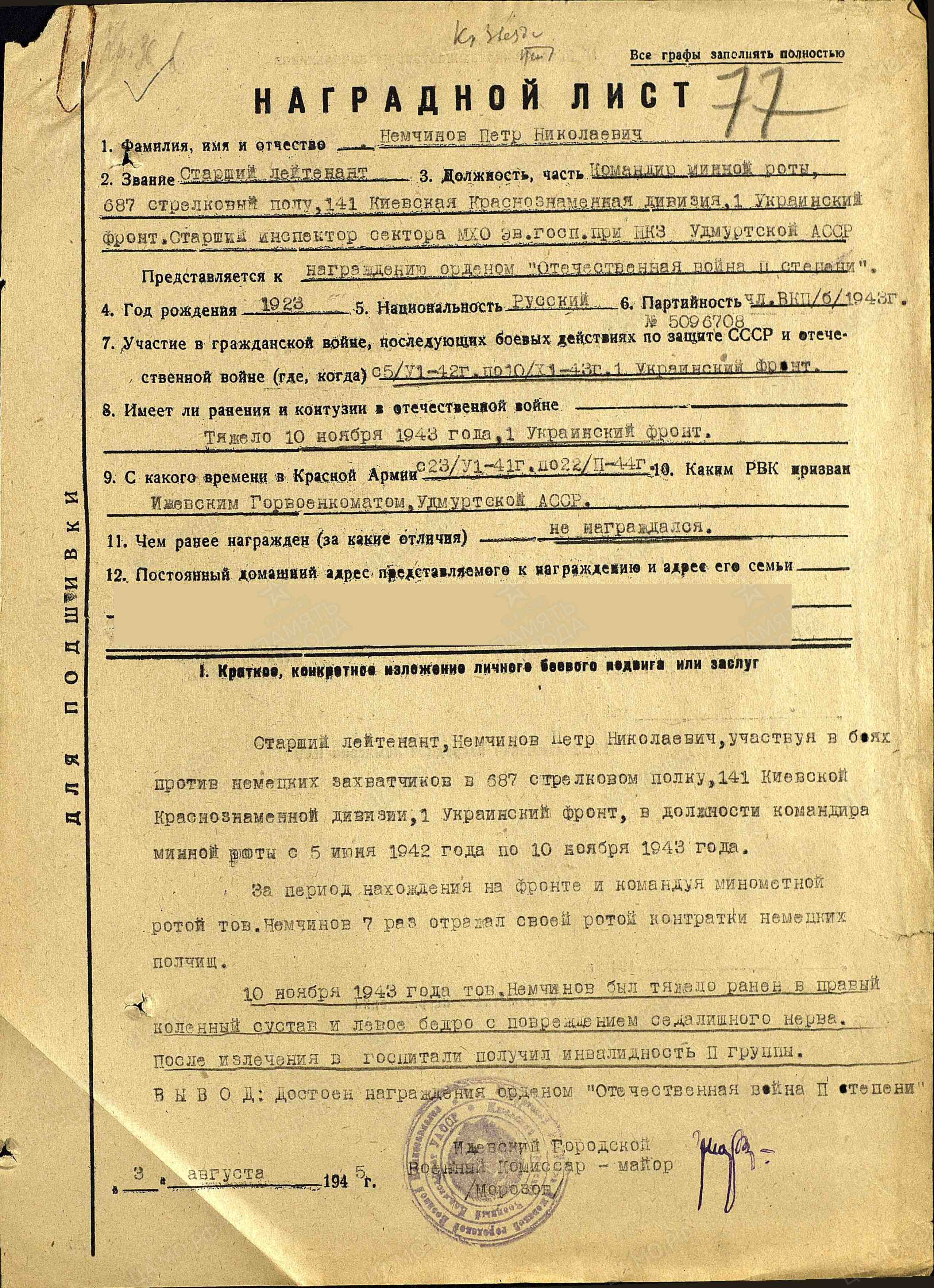 НЕМЧИНОВ Пётр Николаевич, 1923, с. Билярск. Мобилизован 25 июня 1941 Ижевским ГВК УдмАССР. С 5 июня 1942 воевал на Воронежском, Центральном, 1 Украинском фронте в составе 40 А/ 60 А. Член ВКП(б). Участник битвы на Курской дуге, освобождения Украины. Ст. лейтенант, ком. взвода/ ком. миномётной роты 745 СП/ 687 СП 141 СД. 10 нояб. 1943 получил тяжёлое в прав. коленный сустав и лев. бедро с повреждением седалищного нерва. Выписан из госпиталя 22 фев. 1944 по инвалидности 2 гр. Работал ст. инспектором сектора МХО эвакогоспиталей НКЗ УдмАССР. Награждён медалью «За отвагу», орденами Красной Звезды (1947), орденом Отечественной войны 1 ст. (1985).