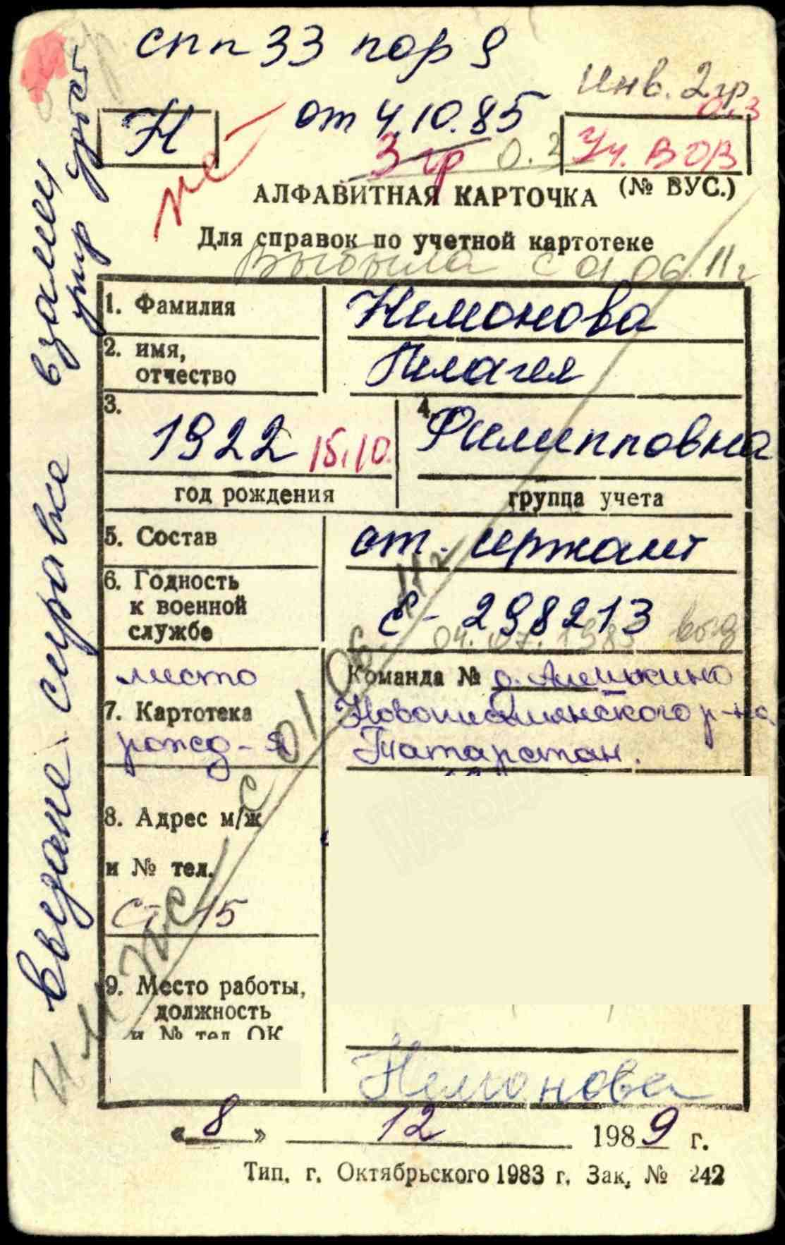 Родилась 15.10.1922г.в д. Алешкино Ново-Письмянского района ТАССР.