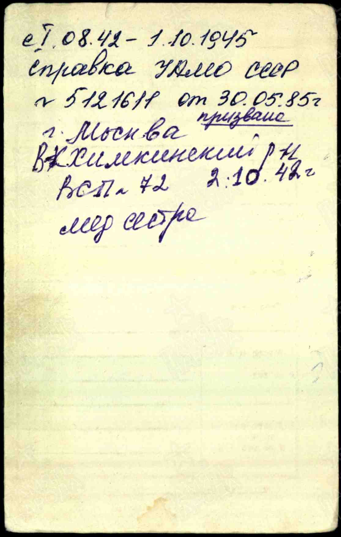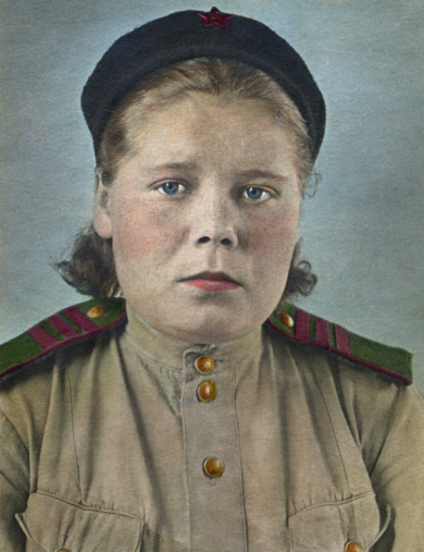 Призвана: 01.08.1942г. Химкинским РВК, Московская обл., Химкинский район. Старший сержант медслужбы в Военно-санитарном поезде N 72. Демобилизована 01.10.1945г.