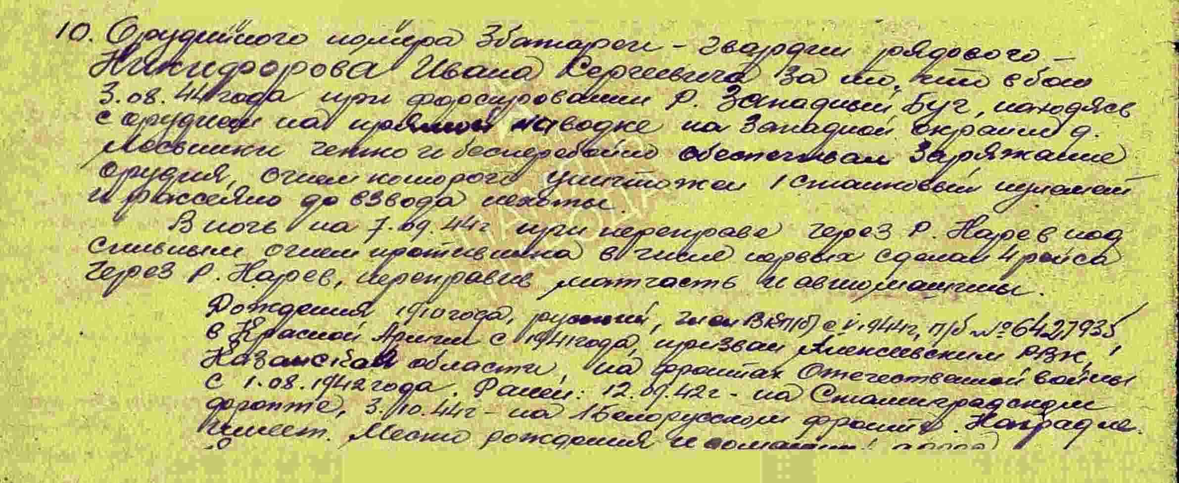 НИКИФОРОВ Иван Сергеевич, 1910, с. Большой Красный Яр. Жил в с. Сахаровка. Мобилизован 4 сент./ 30 нояб. 1941 Алексеевским РВК. С 1 авг. 1942 воевал на Сталинградском, Центральном, Белорусском, 1 и 2 Белорусском фронте в составе 62 А/ 65 А/ 2 УдА. Участник обороны Сталинграда, битвы на Курской дуге, освобождения Белоруссии и Польши. Гв. красноармеец, стрелок 109 гв. СП/ орудийный номер, заряжающий 86 гв. АП 37 гв. СД. Член ВКП(б) с 1944. Перенёс три ранения: 12 сент. 1942, 3 окт. 1944, 27 марта 1945 – тяжело ранен в боях за г. Данциг (Гданьск). Ошибочно учтён погибшим. В результате третьего ранения получил инвалидность. Награждён медалью «За боевые заслуги», орденом Отечественной войны 1 ст. (1985).