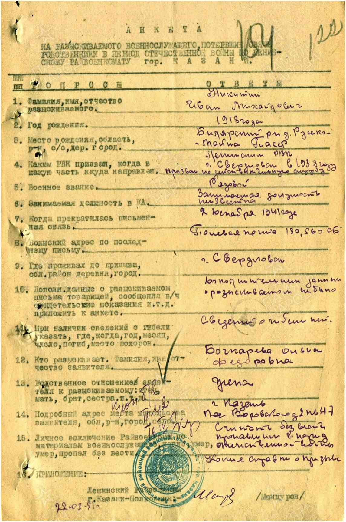 НИКИТИН Иван Михайлович, 1918, д. Русская Майна. Призван на службу в РККА в 1938 Ленинским РВК г. Свердловск. Красноармеец. Письменная связь с семьёй прекратилась 2 дек. 1941. Учтён пропавшим без вести.
