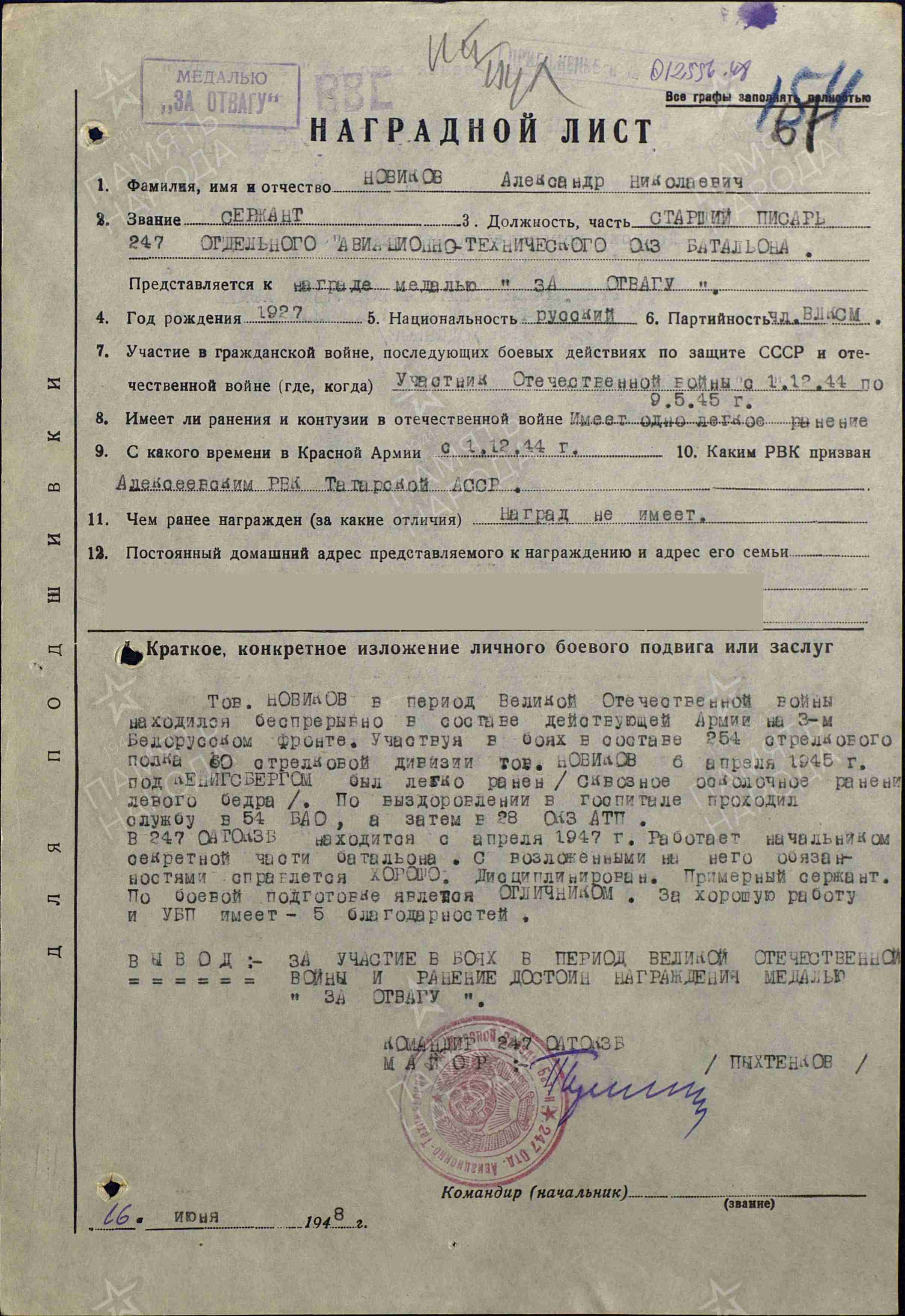 НОВИКОВ Александр Николаевич, 1927, с. Алексеевское. Мобилизован 1 дек. 1944 Алексеевским РВК. Член ВЛКСМ. Красноармеец, 252 СП 70 СД 43 А 3 Белорусского фронта. Получил лёгкое осколочное ранение в левое бедро в боях за г. Кёнигсберг 6 апр. 1945. После госпиталя служил в 54 батальоне аэродромного обслуживания, 793 БАО 1 ВА. С 1947 – ст. сержант, ст. писарь, нач. секретной части 247 отд. авиационно-технического батальона 4 ВА. В дальнейшем служил офицером административной службы ВВС, ст. лейтенант. Награждён медалями «За взятие Кёнигсберга», «За отвагу» (1951), «За боевые заслуги» (1955). Уволен в запас 29 фев. 1960.